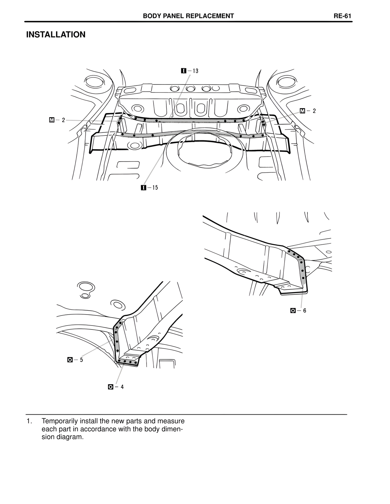 BODY PANEL REPLACEMENT RE-61 INSTALLATION I - 13 M - 2 M - 2 I - 15 O - 5 O - 4 O - 6 1. Temporarily install the new parts and measure each part in accordance with the body dimen- sion diagram.
