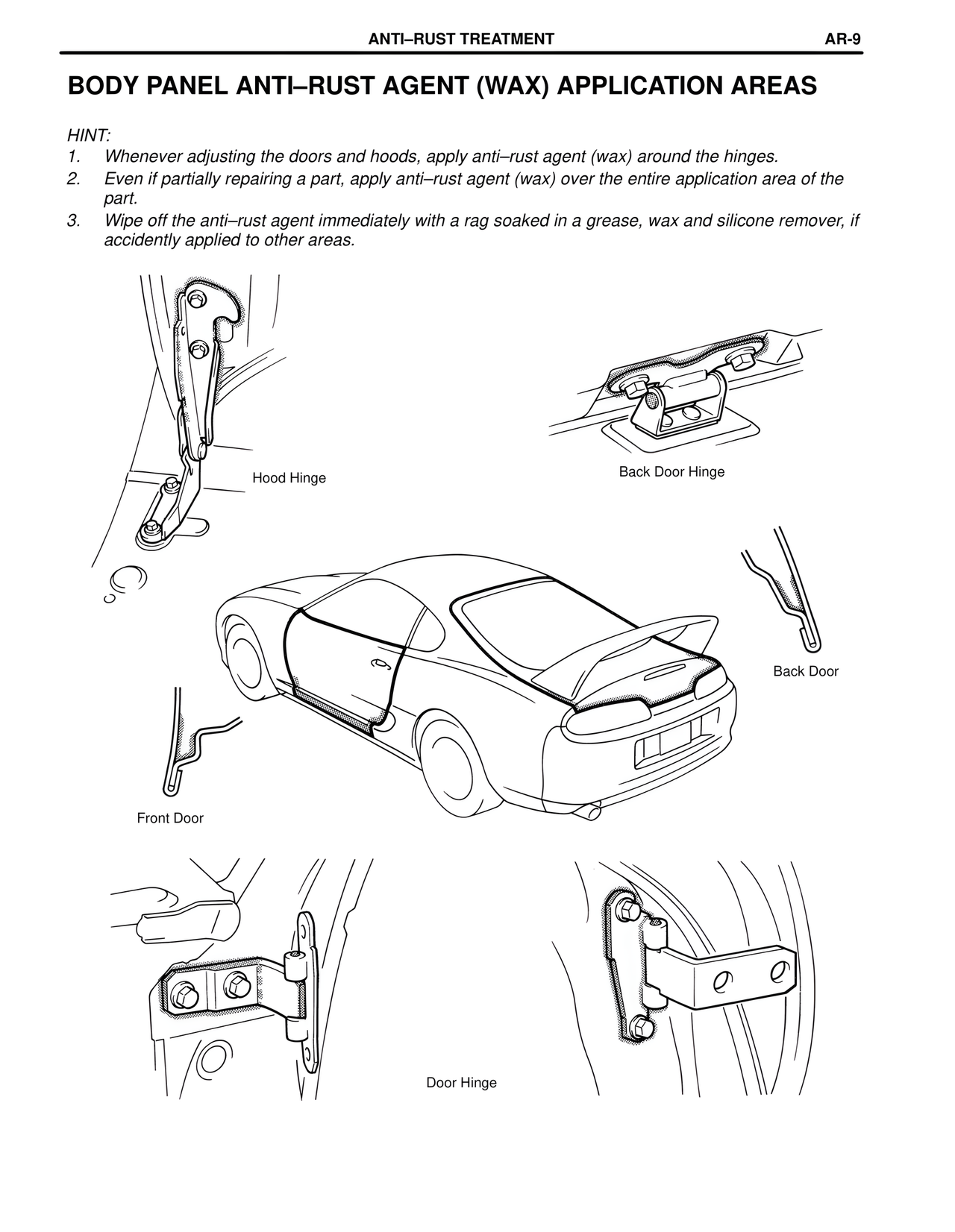1. Whenever adjusting the doors and hoods, apply anti–rust agent (wax) around the hinges.