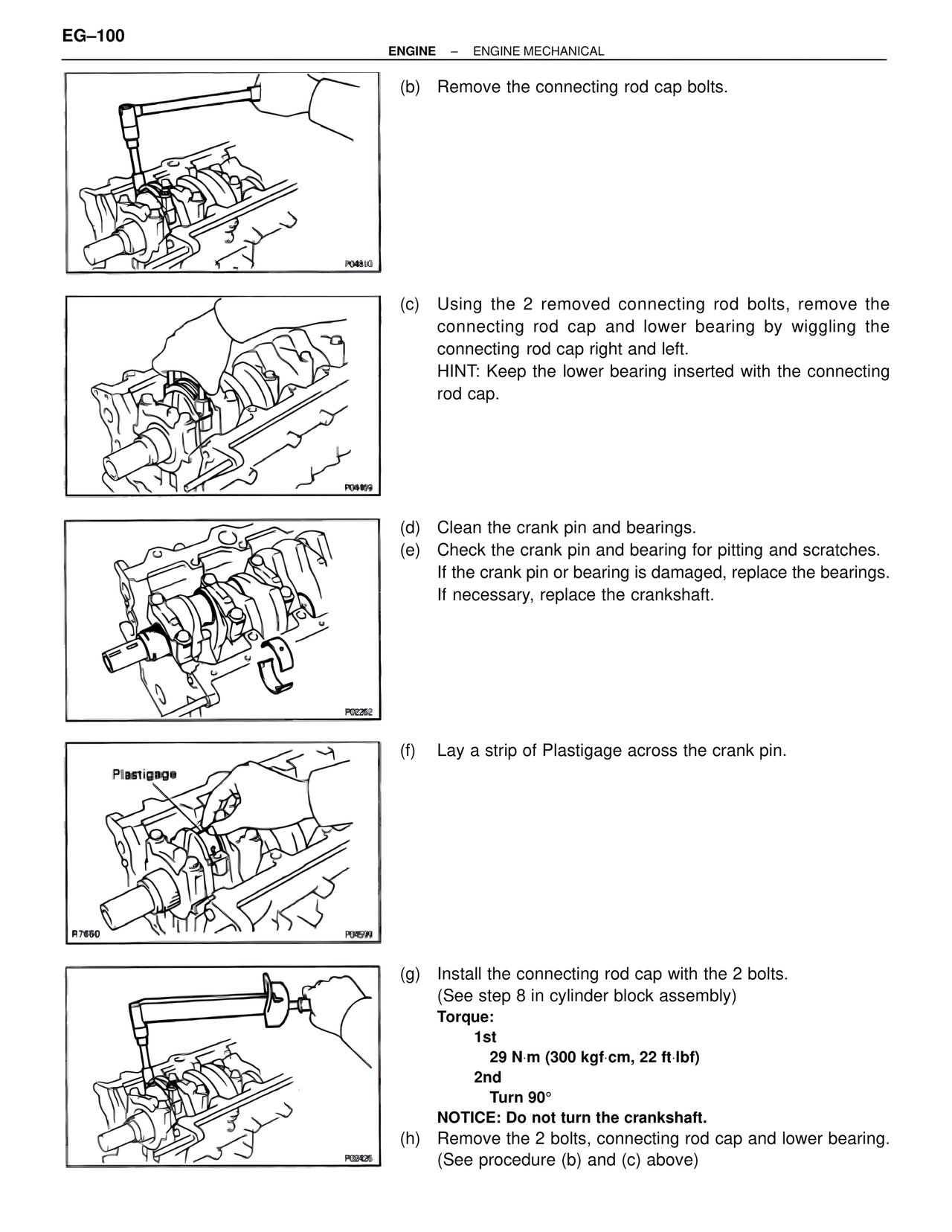 (h) Remove the 2 bolts, connecting rod cap and lower bearing.