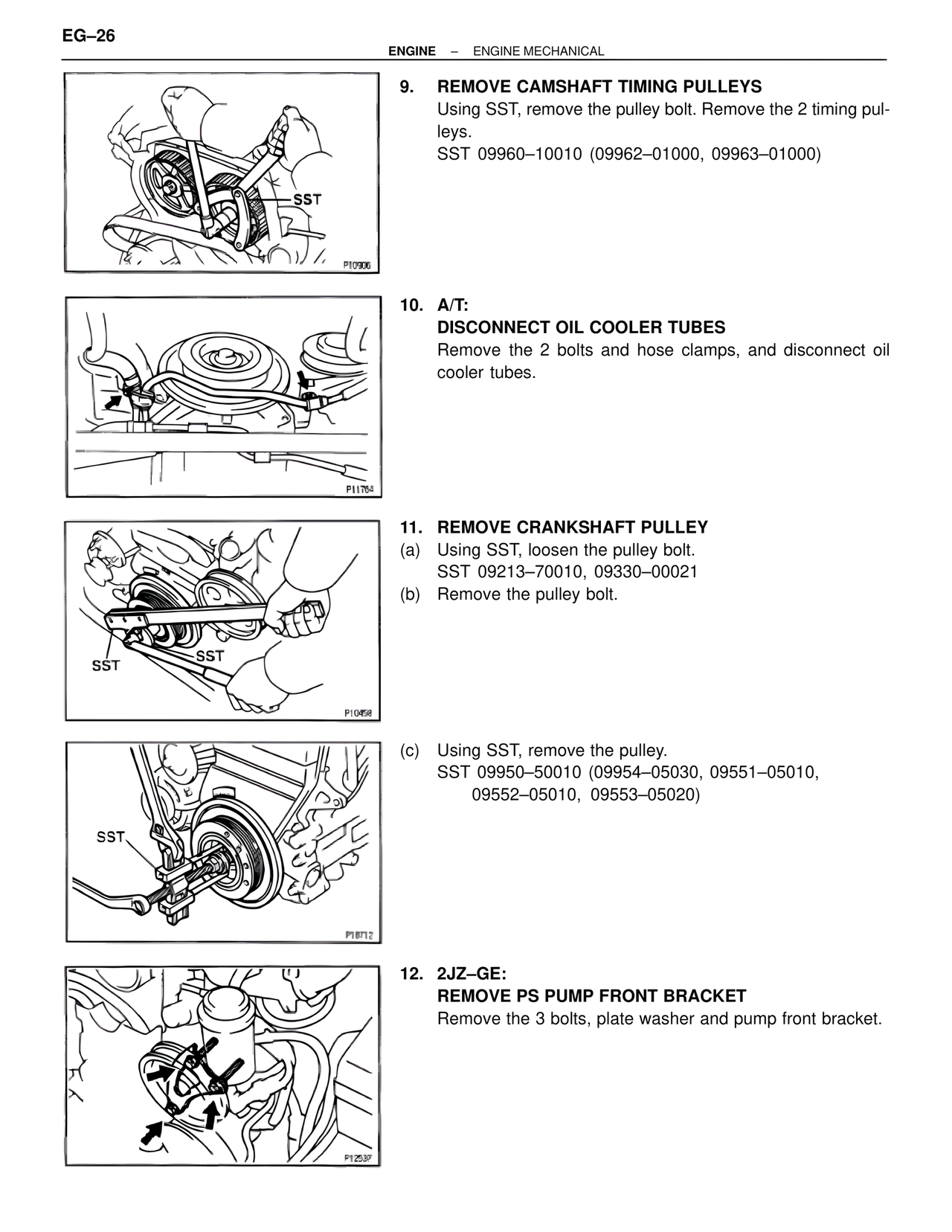 Using SST, remove the pulley bolt. Remove the 2 timing pulleys.