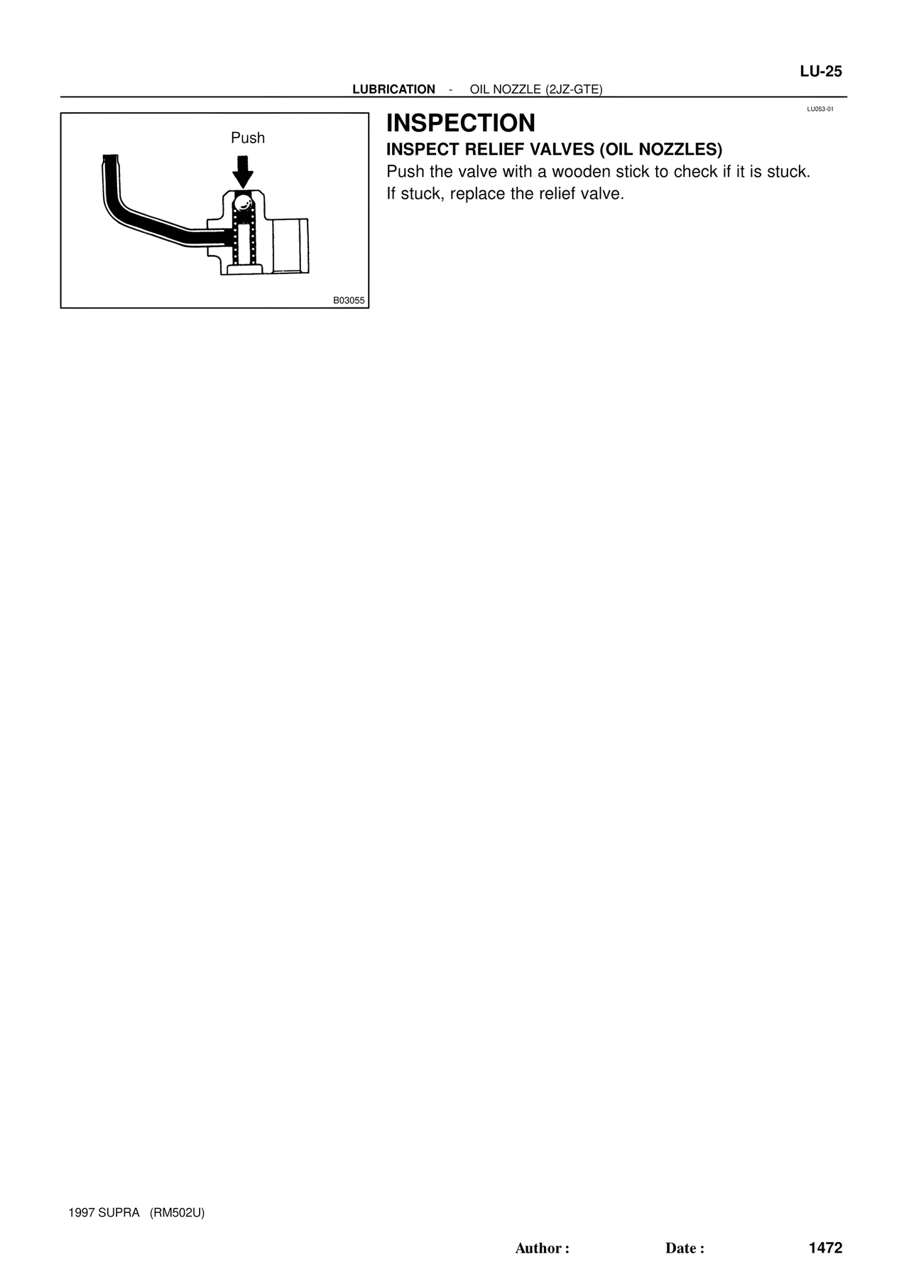 LU-25 LUBRICATION - OIL NOZZLE (2JZ-GTE) LU053-01 Push B03055 INSPECTION INSPECT RELIEF VALVES (OIL NOZZLES) Push the valve with a wooden stick to check if it is stuck. If stuck, replace the relief valve. 1997 SUPRA (RM502U) Author : Date : 1472