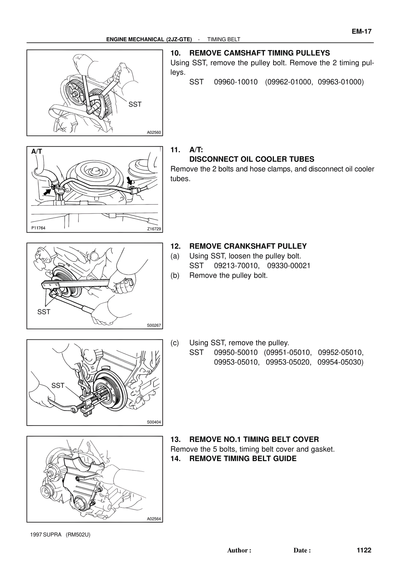 Using SST, remove the pulley bolt. Remove the 2 timing pulleys.