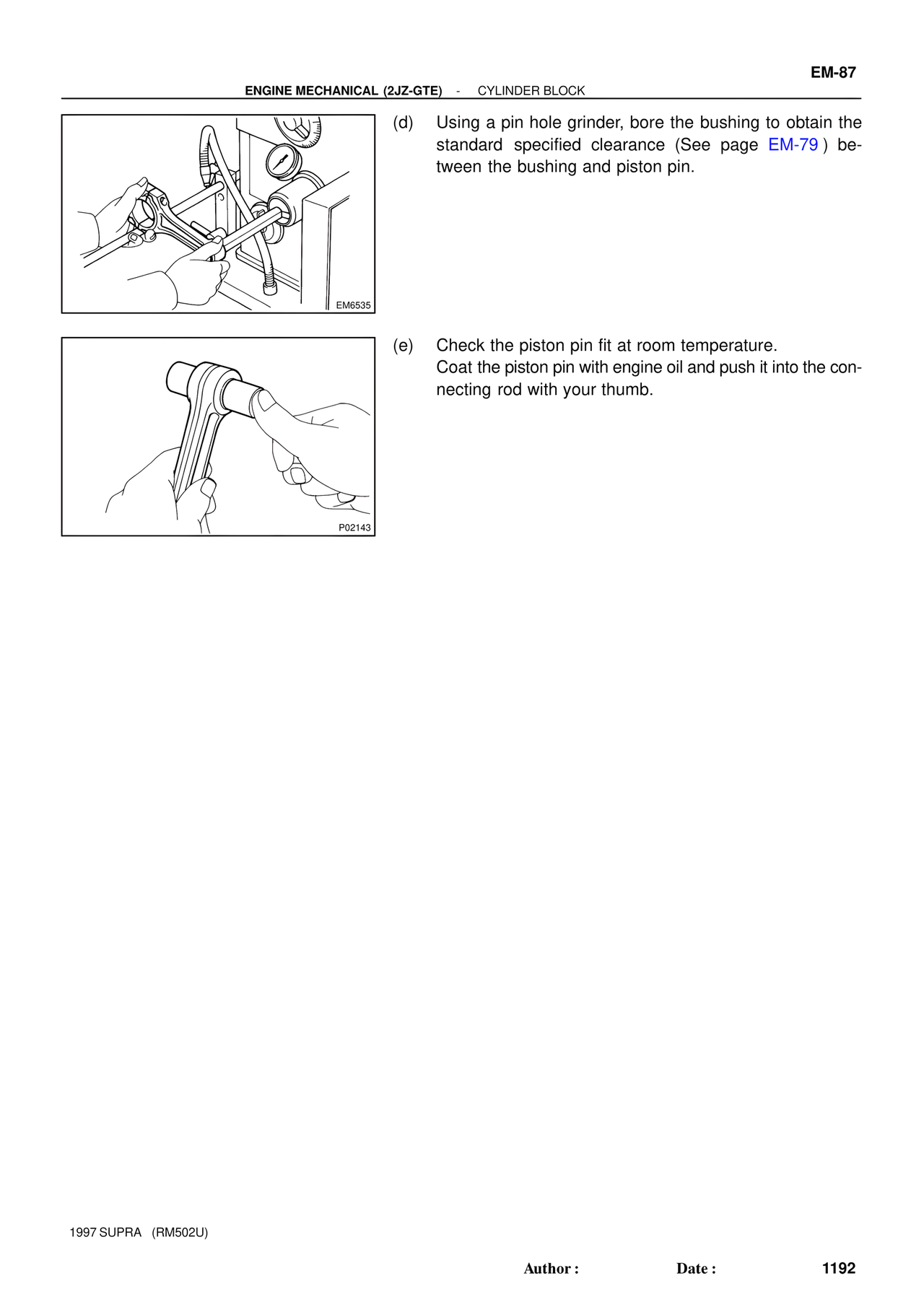 (d) Using a pin hole grinder, bore the bushing to obtain the standard specified clearance (See page EM-79 ) between the bushing and piston pin.