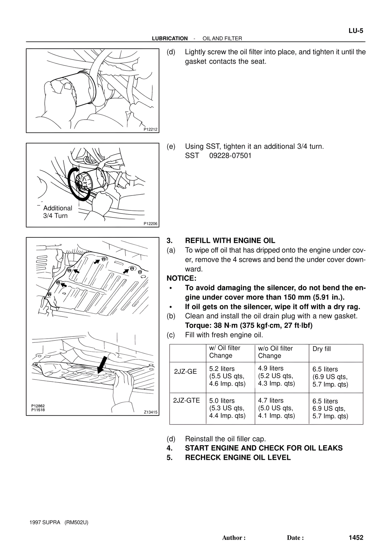 2JZ-GTE | 5.0 liters (5.3 US qts, 4.4 Imp. qts) | 4.7 liters (5.0 US qts, 4.1 Imp. qts) | 6.5 liters 6.9 US qts, 5.7 Imp. qts)