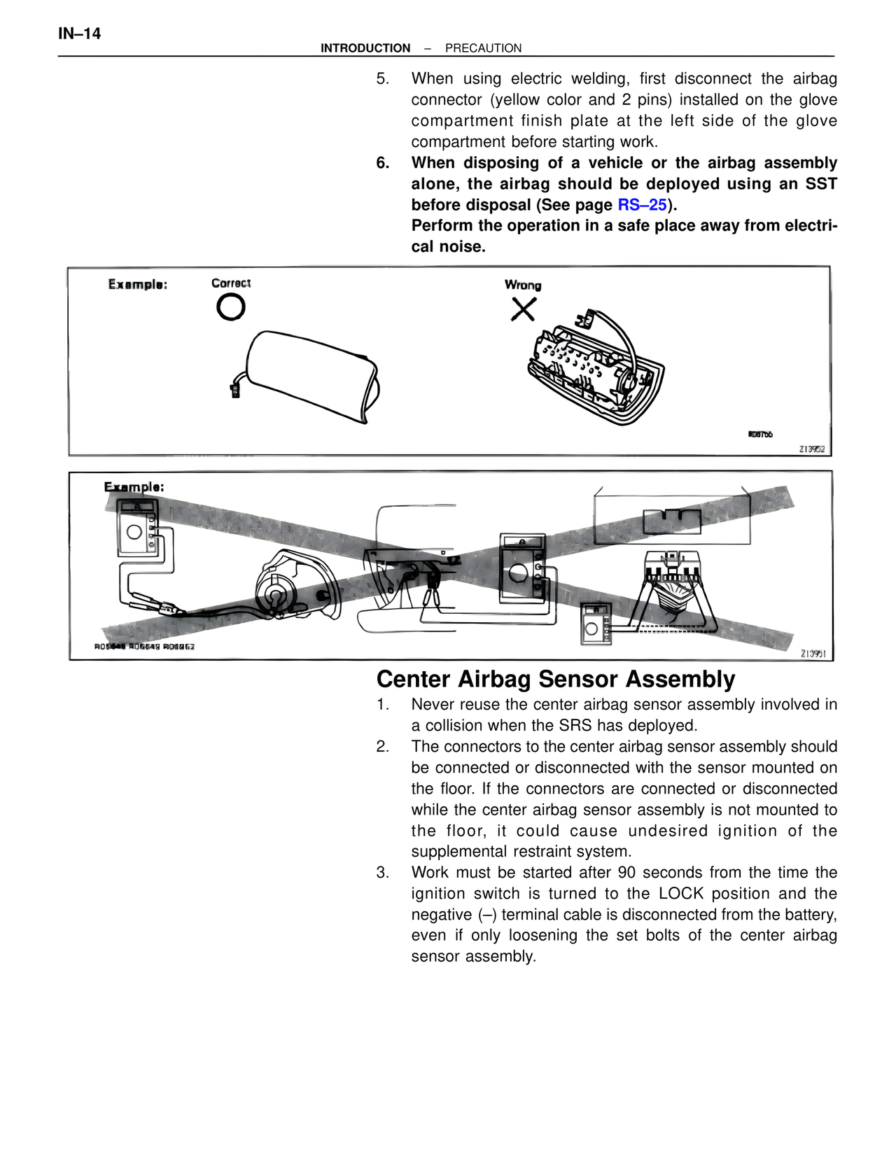 6. When disposing of a vehicle or the airbag assembly alone, the airbag should be deployed using an SST before disposal (See page RS–25).