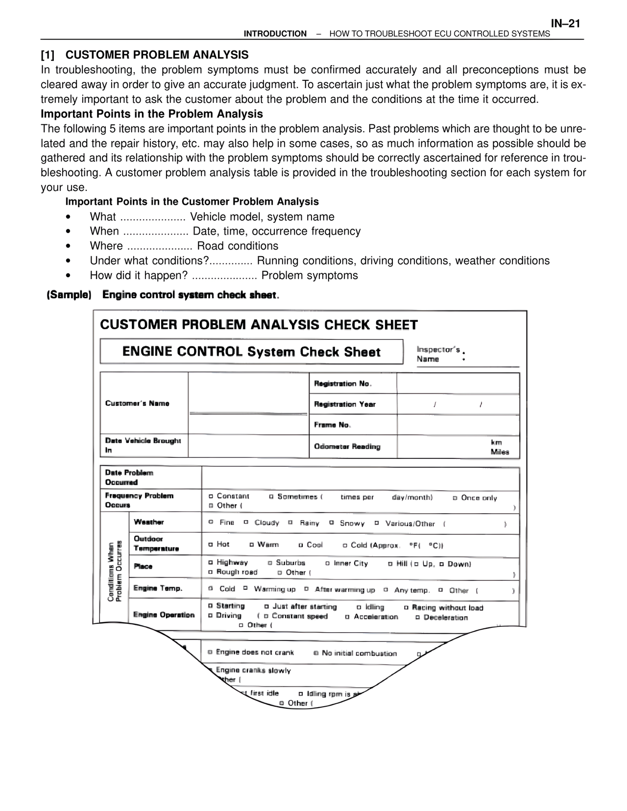 The following 5 items are important points in the problem analysis. Past problems which are thought to be unrelated and the repair history, etc. may also help in some cases, so as much information as possible should be gathered and its relationship with the problem symptoms should be correctly ascertained for reference in troubleshooting. A customer problem analysis table is provided in the troubleshooting section for each system for your use.