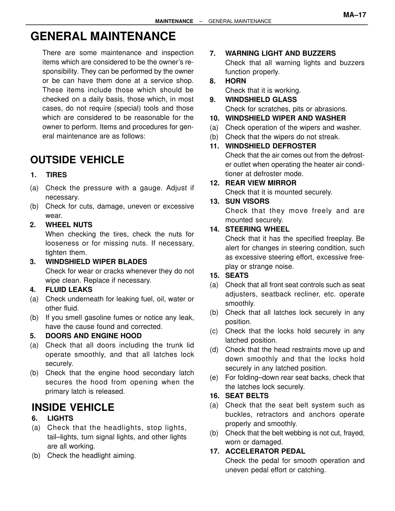 There are some maintenance and inspection items which are considered to be the owner's responsibility. They can be performed by the owner or be can have them done at a service shop. These items include those which should be checked on a daily basis, those which, in most cases, do not require (special) tools and those which are considered to be reasonable for the owner to perform. Items and procedures for general maintenance are as follows: