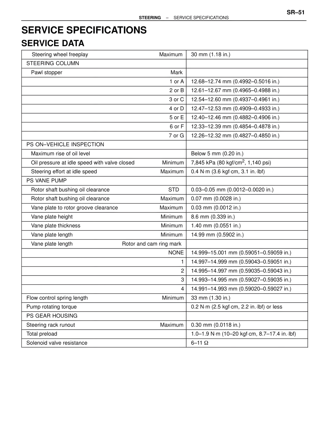 STEERING – SERVICE SPECIFICATIONS