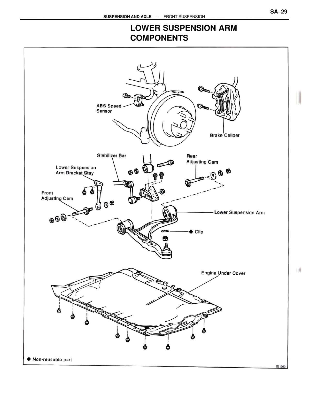 LOWER SUSPENSION ARM COMPONENTS ABS Speed Sensor Brake Caliper Stabilizer Bar Rear Adjusting Cam Lower Suspension Arm Bracket Stay Front Adjusting Cam Lower Suspension Arm Clip Engine Under Cover ◆ Non-reusable part R11040