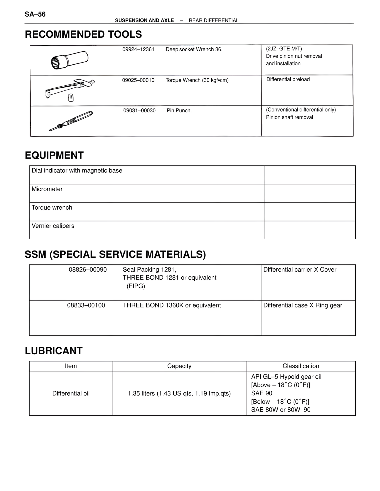 Differential oil 1.35 liters (1.43 US qts, 1.19 Imp.qts) API GL–5 Hypoid gear oil