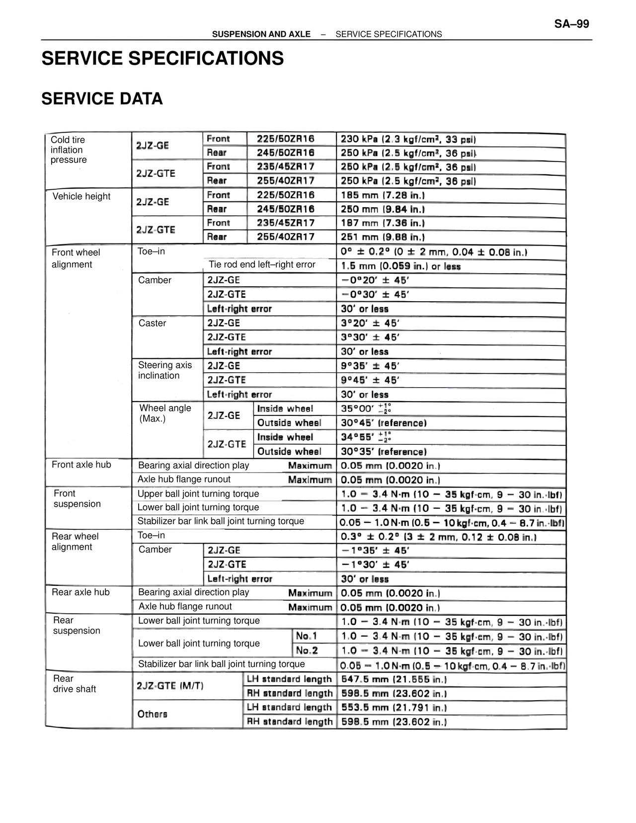 SUSPENSION AND AXLE – SERVICE SPECIFICATIONS
