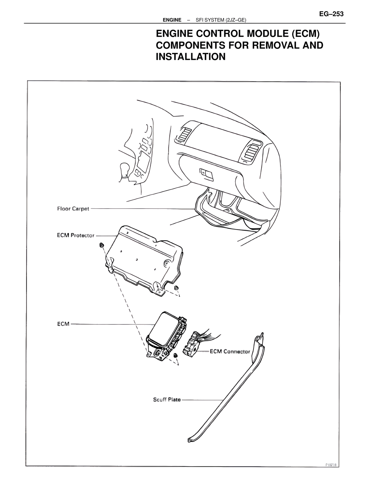 EG–253 ENGINE – SFI SYSTEM (2JZ–GE) ENGINE CONTROL MODULE (ECM) COMPONENTS FOR REMOVAL AND INSTALLATION Floor Carpet ECM Protector ECM ECM Connector Scuff Plate P18718