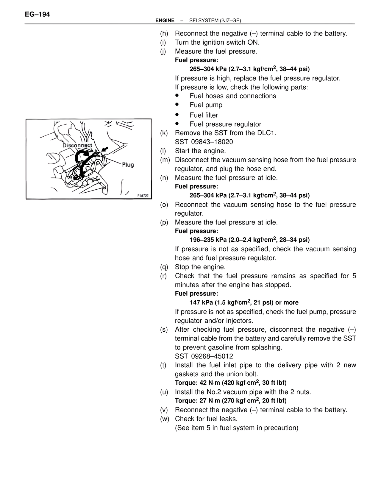 (s) After checking fuel pressure, disconnect the negative (–) terminal cable from the battery and carefully remove the SST to prevent gasoline from splashing.