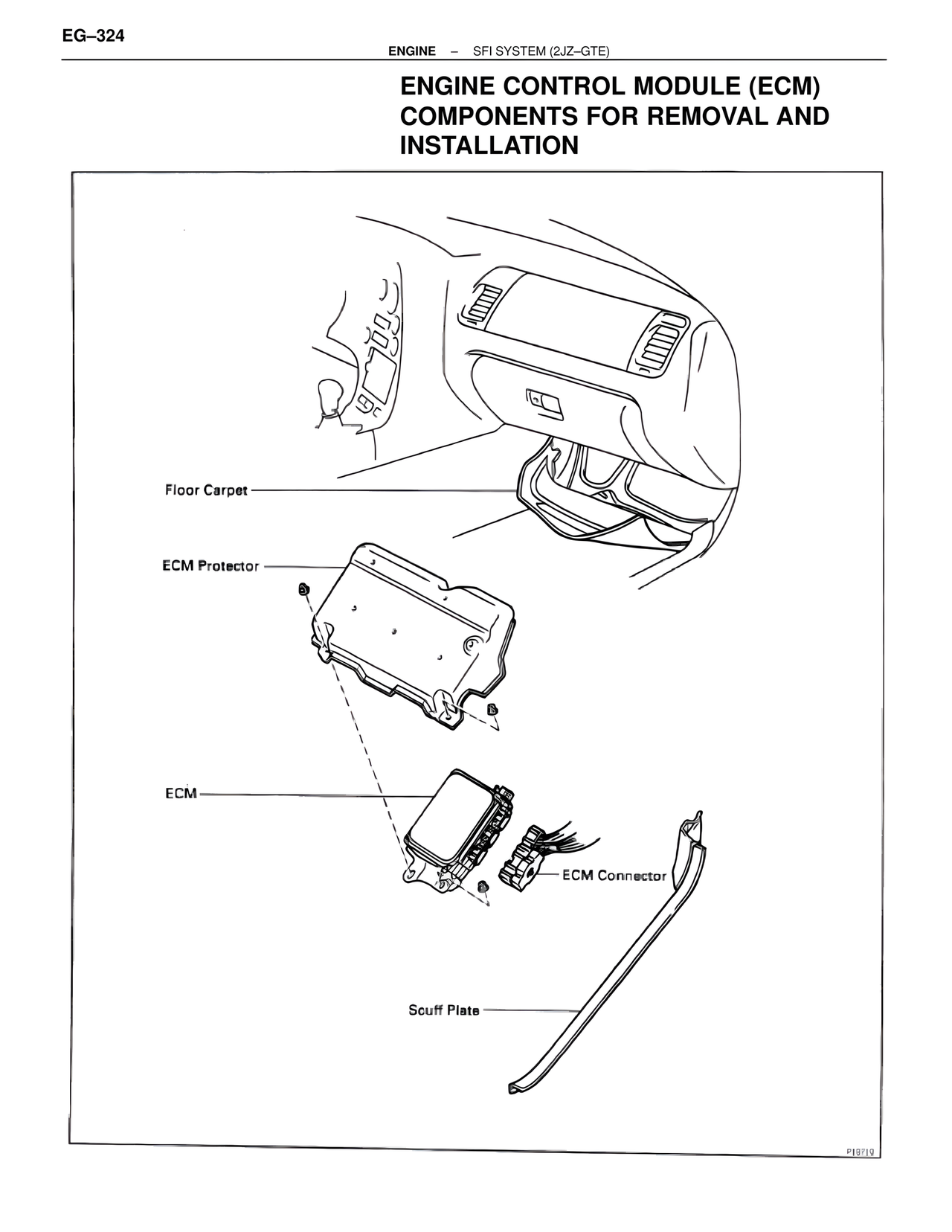 EG–324 ENGINE – SFI SYSTEM (2JZ–GTE) ENGINE CONTROL MODULE (ECM) COMPONENTS FOR REMOVAL AND INSTALLATION Floor Carpet ECM Protector ECM ECM Connector Scuff Plate P18719