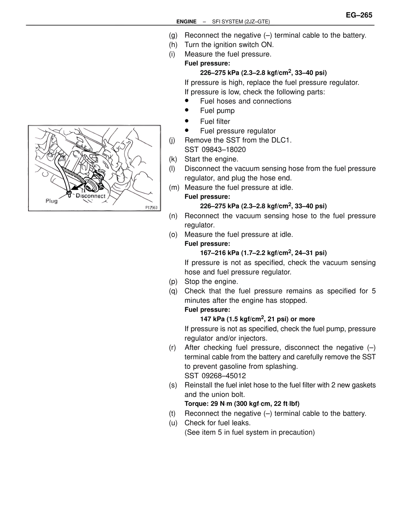 (r) After checking fuel pressure, disconnect the negative (–) terminal cable from the battery and carefully remove the SST to prevent gasoline from splashing.