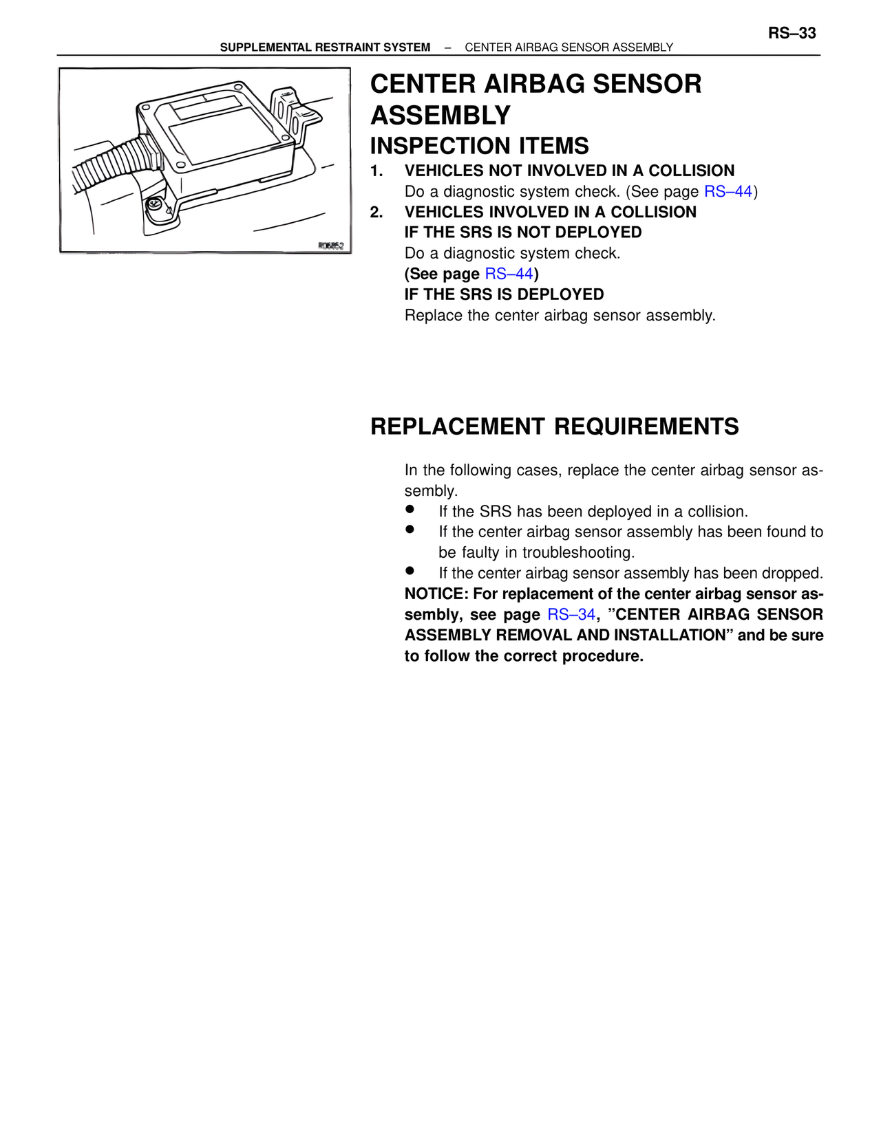NOTICE: For replacement of the center airbag sensor assembly, see page RS–34, "CENTER AIRBAG SENSOR ASSEMBLY REMOVAL AND INSTALLATION" and be sure to follow the correct procedure.