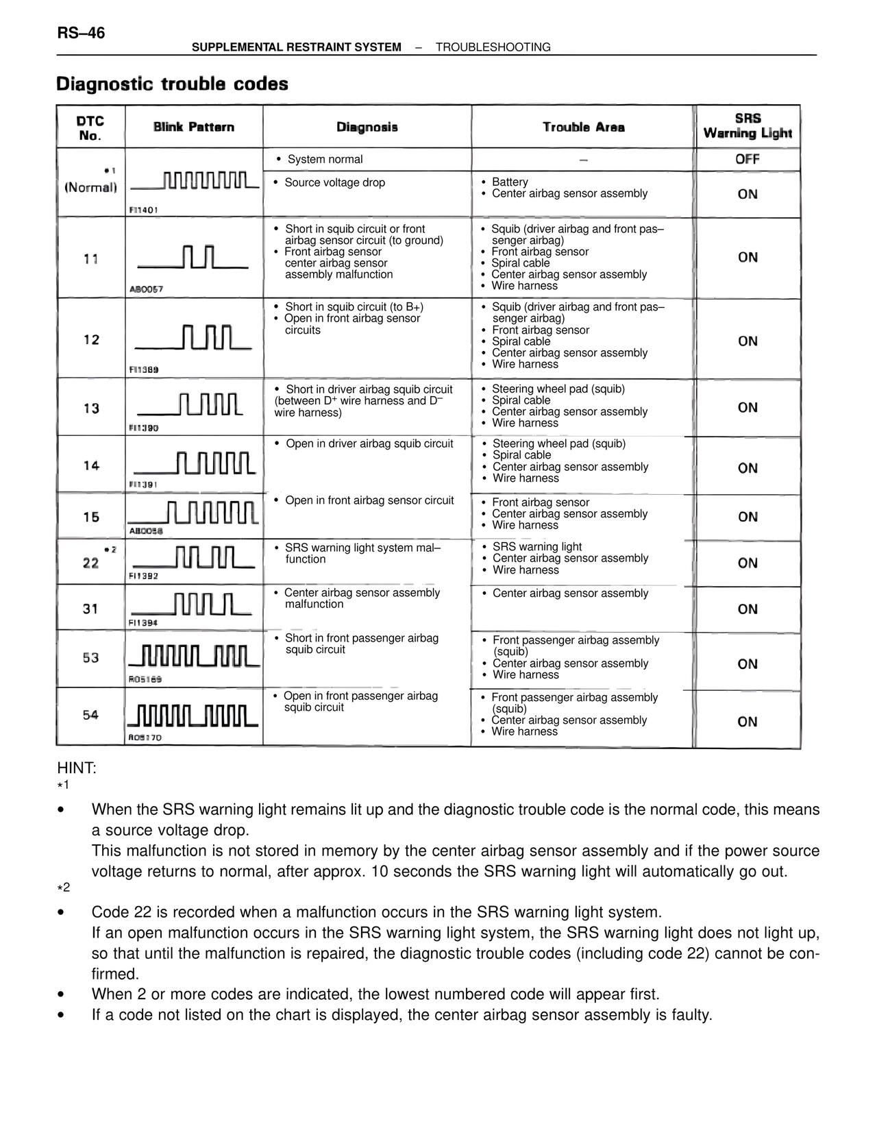 DTC No. | Blink Pattern | Diagnosis | Trouble Area | SRS Warning Light