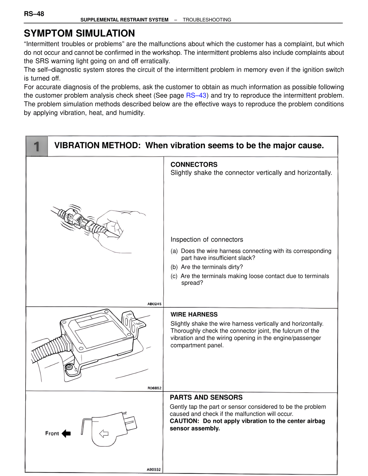 For accurate diagnosis of the problems, ask the customer to obtain as much information as possible following the customer problem analysis check sheet (See page RS–43) and try to reproduce the intermittent problem.