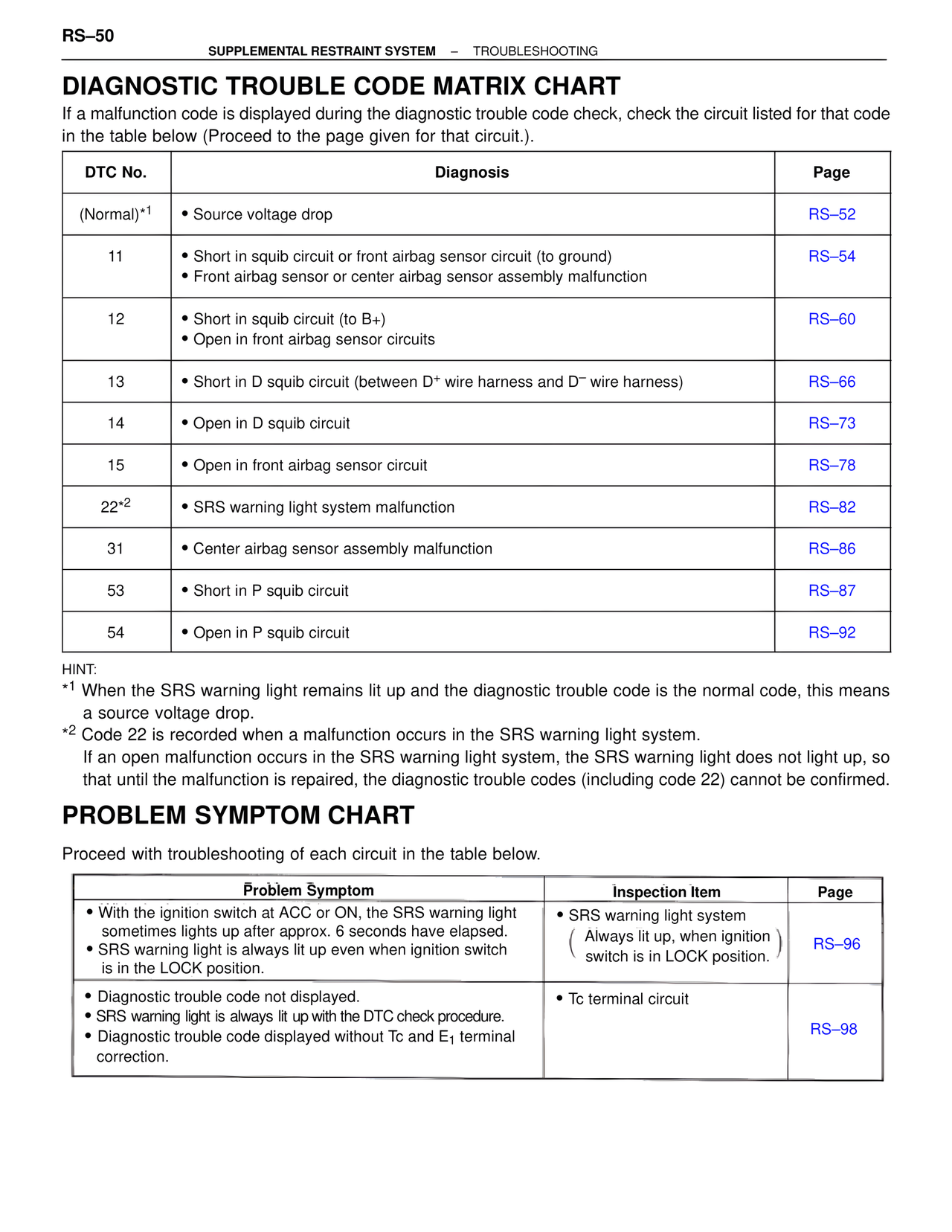 22*2 | • SRS warning light system malfunction | RS–82