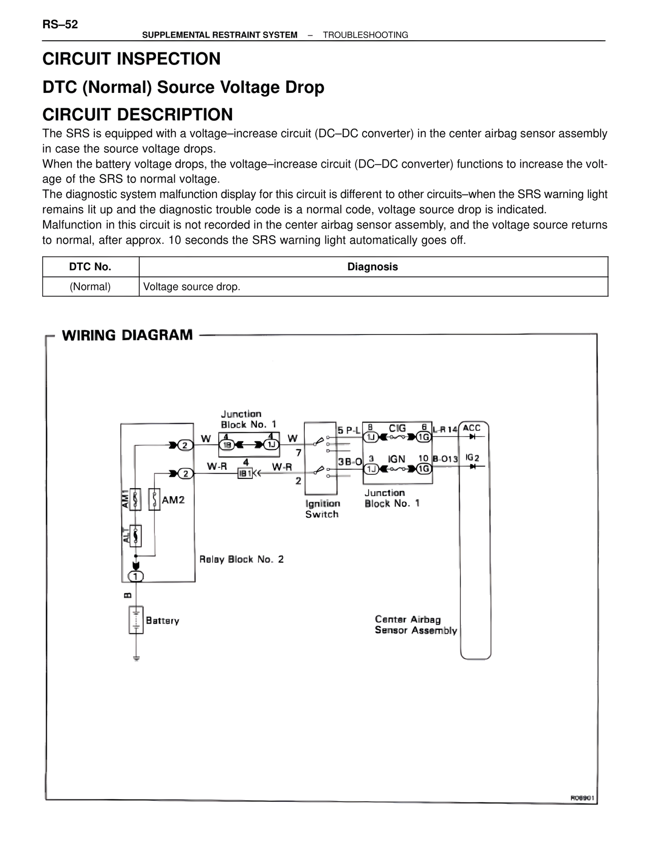 The SRS is equipped with a voltage–increase circuit (DC–DC converter) in the center airbag sensor assembly in case the source voltage drops.