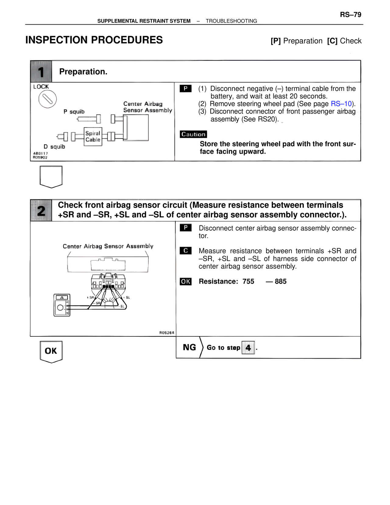+SR and –SR, +SL and –SL of center airbag sensor assembly connector.).