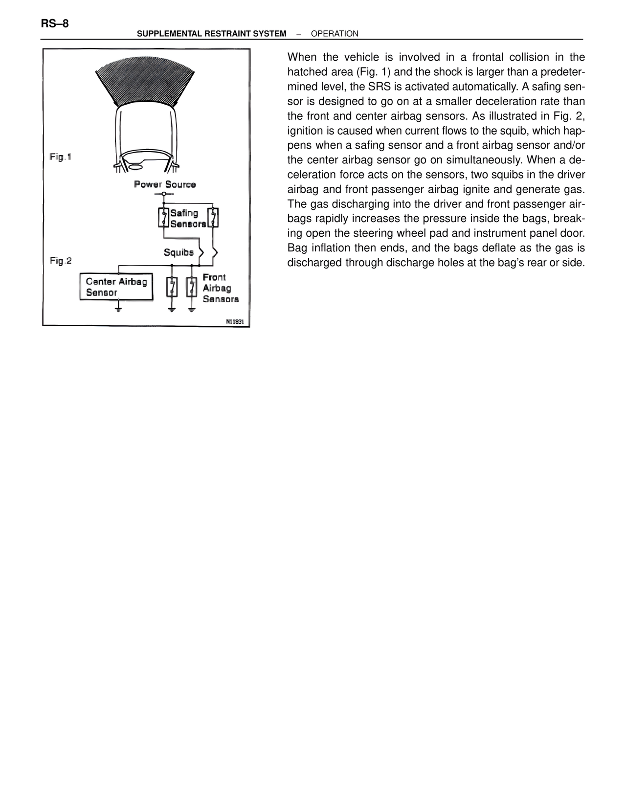 When the vehicle is involved in a frontal collision in the hatched area (Fig. 1) and the shock is larger than a predetermined level, the SRS is activated automatically. A safing sensor is designed to go on at a smaller deceleration rate than the front and center airbag sensors. As illustrated in Fig. 2, ignition is caused when current flows to the squib, which happens when a safing sensor and a front airbag sensor and/or the center airbag sensor go on simultaneously. When a deceleration force acts on the sensors, two squibs in the driver airbag and front passenger airbag ignite and generate gas. The gas discharging into the driver and front passenger airbags rapidly increases the pressure inside the bags, breaking open the steering wheel pad and instrument panel door. Bag inflation then ends, and the bags deflate as the gas is discharged through discharge holes at the bag's rear or side.