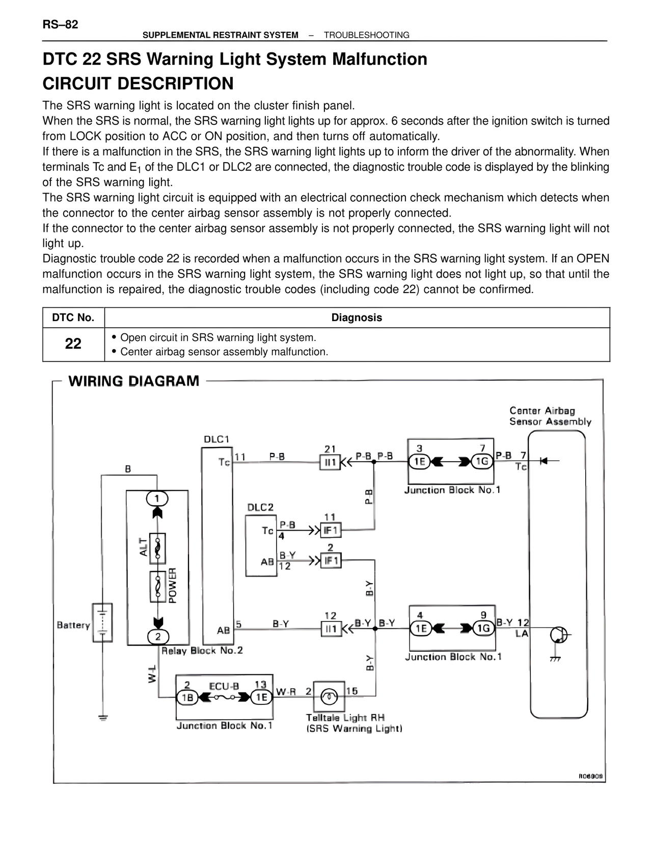 Diagnostic trouble code 22 is recorded when a malfunction occurs in the SRS warning light system. If an OPEN malfunction occurs in the SRS warning light system, the SRS warning light does not light up, so that until the malfunction is repaired, the diagnostic trouble codes (including code 22) cannot be confirmed.