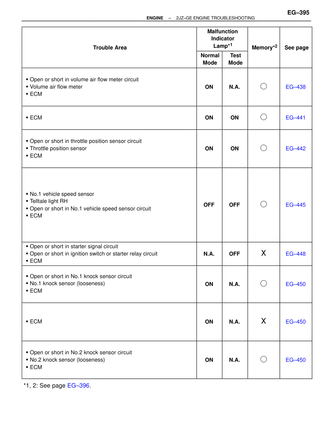 Trouble Area | Malfunction Indicator Lamp*1 | Memory*2 | See page