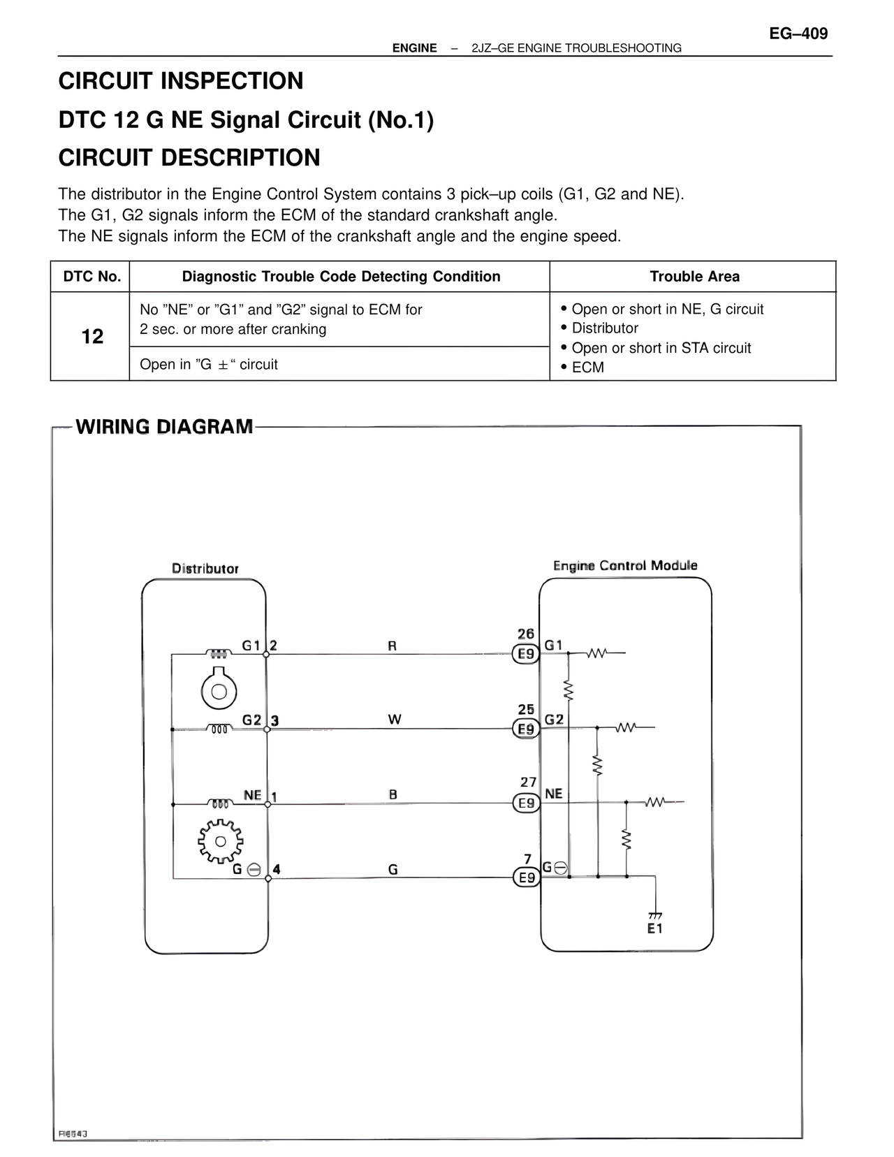 12 | No "NE" or "G1" and "G2" signal to ECM for 2 sec. or more after cranking | • Open or short in NE, G circuit