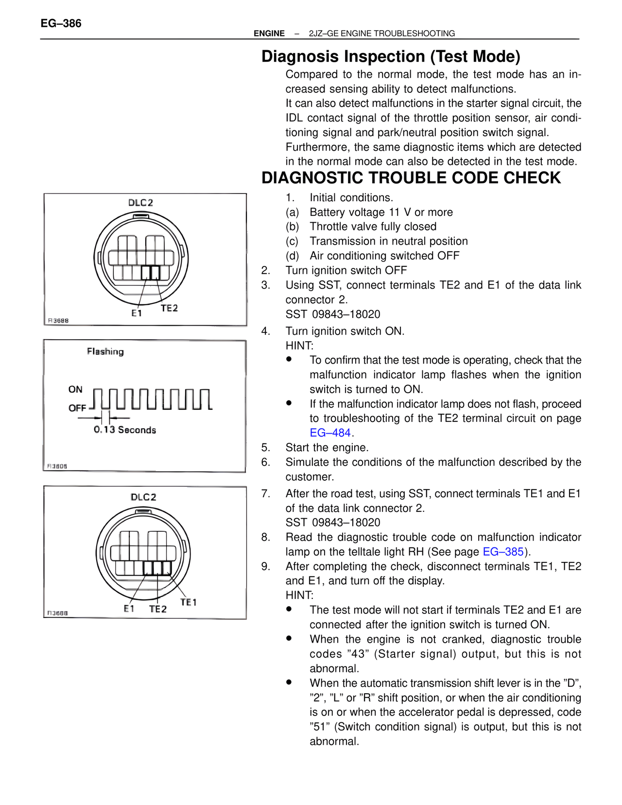 • If the malfunction indicator lamp does not flash, proceed to troubleshooting of the TE2 terminal circuit on page EG–484.