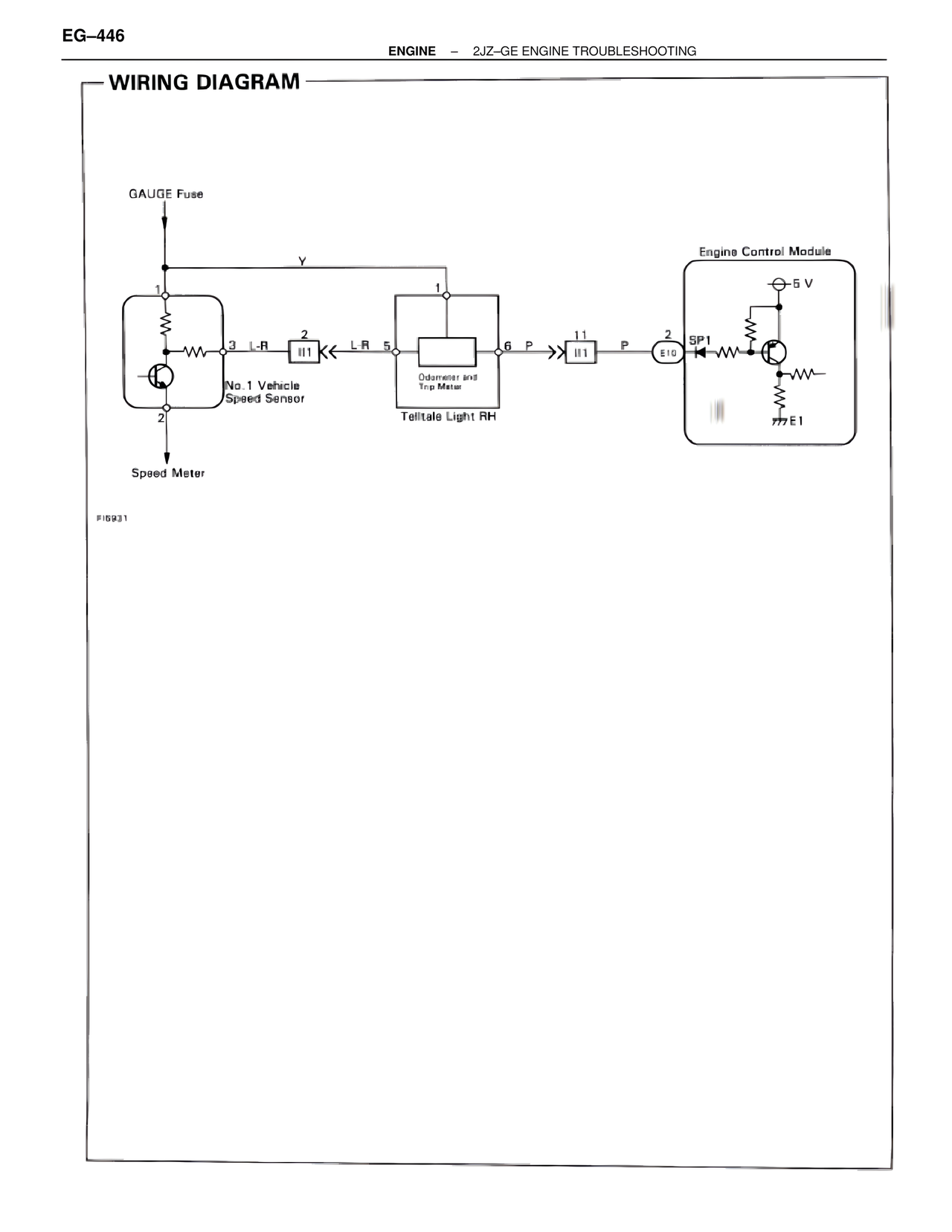 EG–446 ENGINE – 2JZ–GE ENGINE TROUBLESHOOTING WIRING DIAGRAM GAUGE Fuse Y Engine Control Module 5 V 1 1 3 L-R 2 II1 L-R 5 6 P 11 2 II1 P E10 SP1 No.1 Vehicle Speed Sensor Odometer and Trip Meter Telltale Light RH 2 Speed Meter E1 FI6931