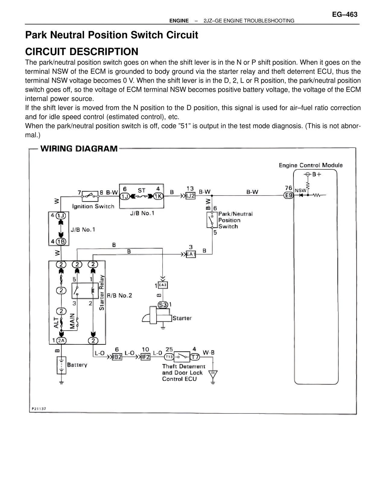 When the park/neutral position switch is off, code "51" is output in the test mode diagnosis. (This is not abnormal.)