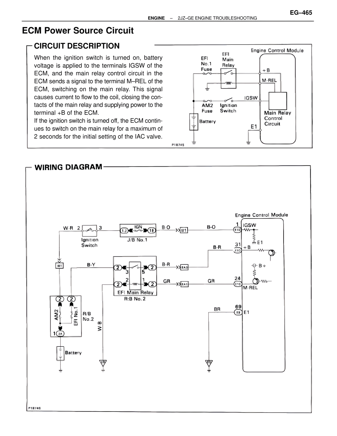 When the ignition switch is turned on, battery voltage is applied to the terminals IGSW of the ECM, and the main relay control circuit in the ECM sends a signal to the terminal M–REL of the ECM, switching on the main relay. This signal causes current to flow to the coil, closing the contacts of the main relay and supplying power to the terminal +B of the ECM.