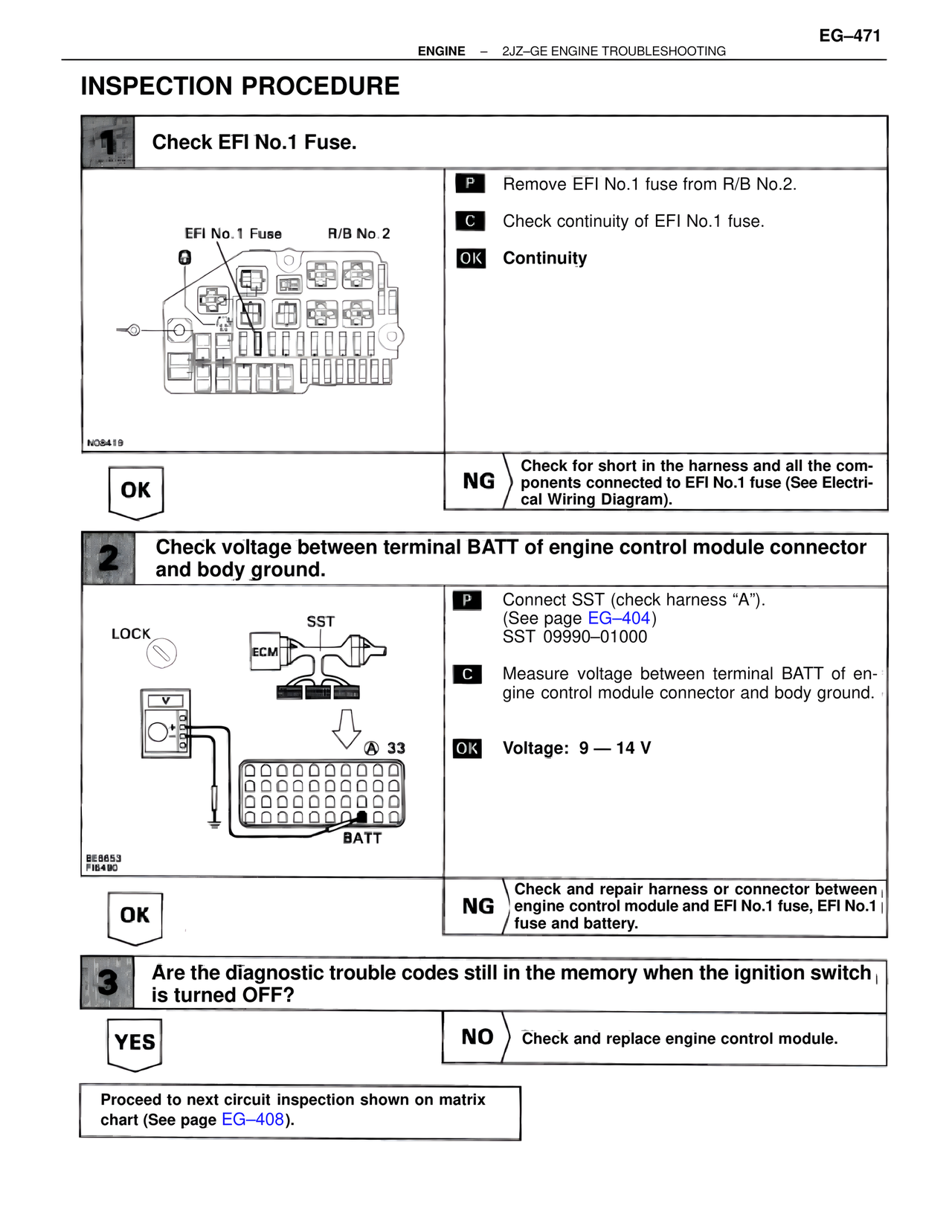 NG Check and repair harness or connector between engine control module and EFI No.1 fuse, EFI No.1 fuse and battery.