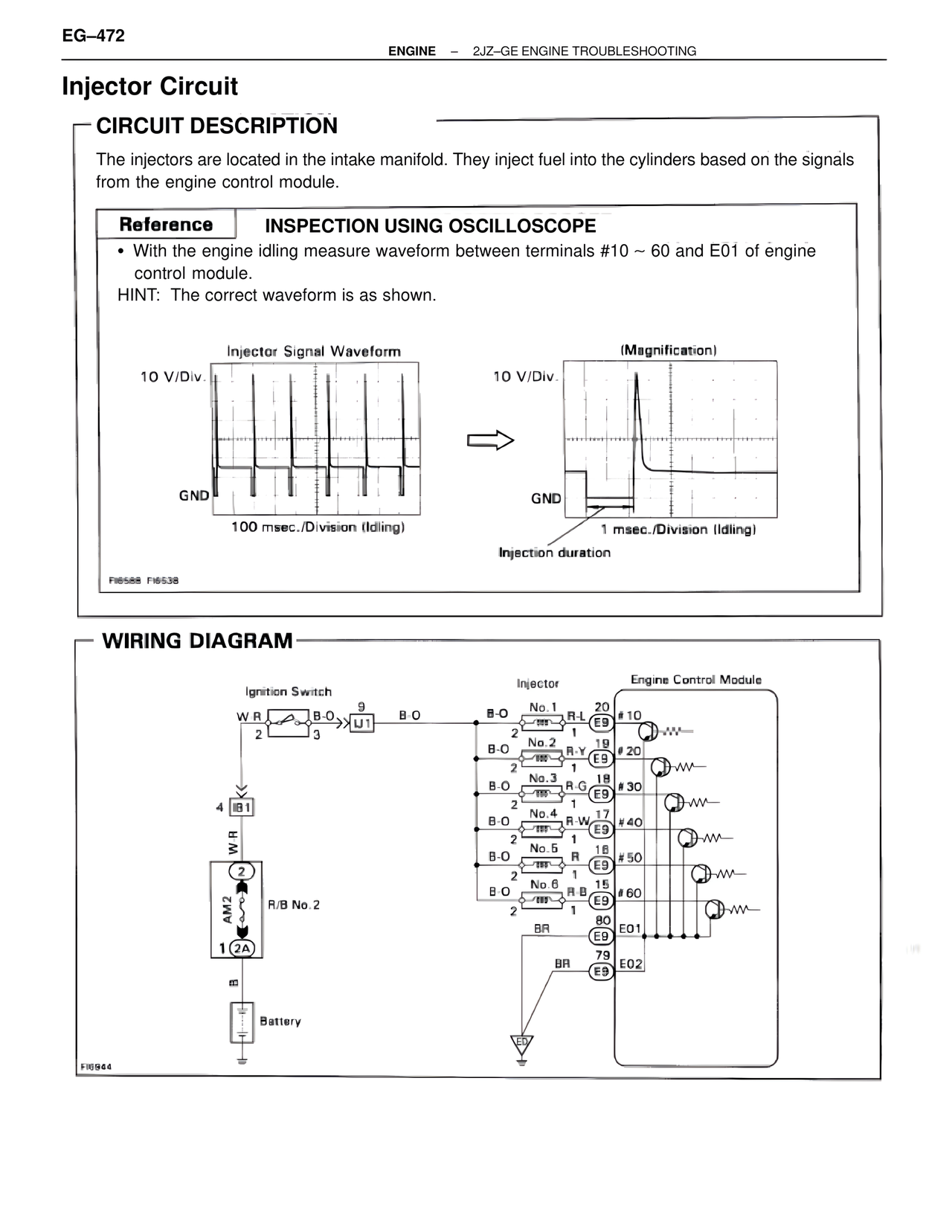 • With the engine idling measure waveform between terminals #10 ~ 60 and E01 of engine control module.
