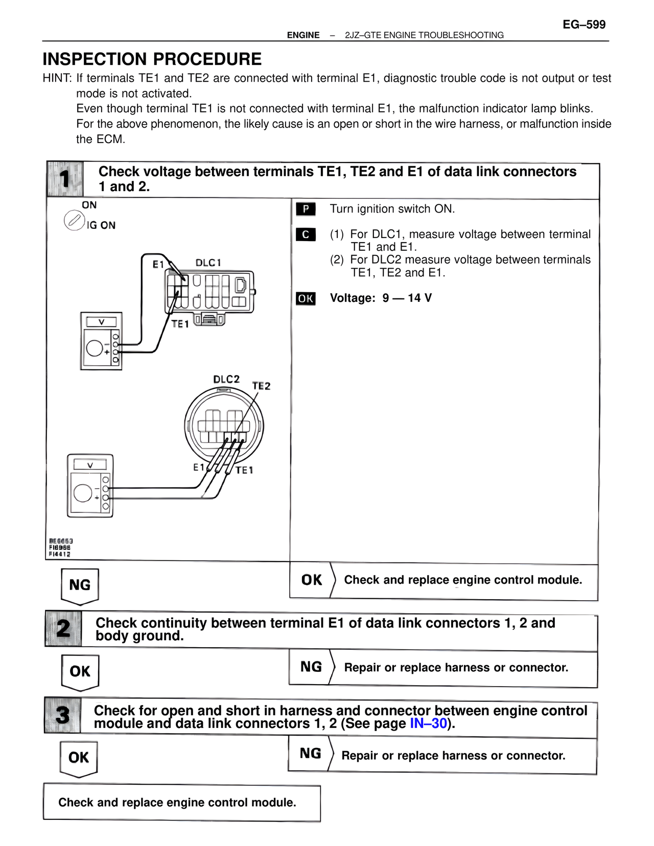 1 Check voltage between terminals TE1, TE2 and E1 of data link connectors