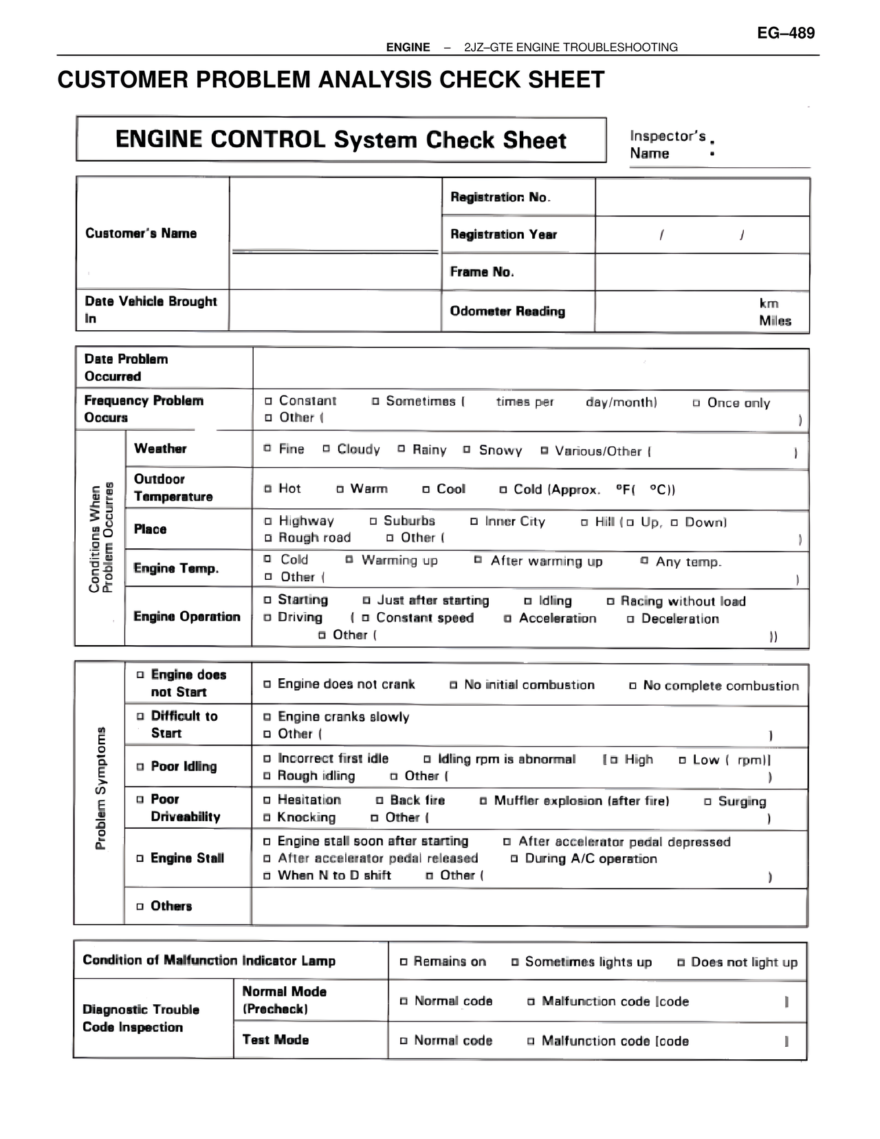 □ Incorrect first idle □ Idling rpm is abnormal (□ High □ Low ( rpm))