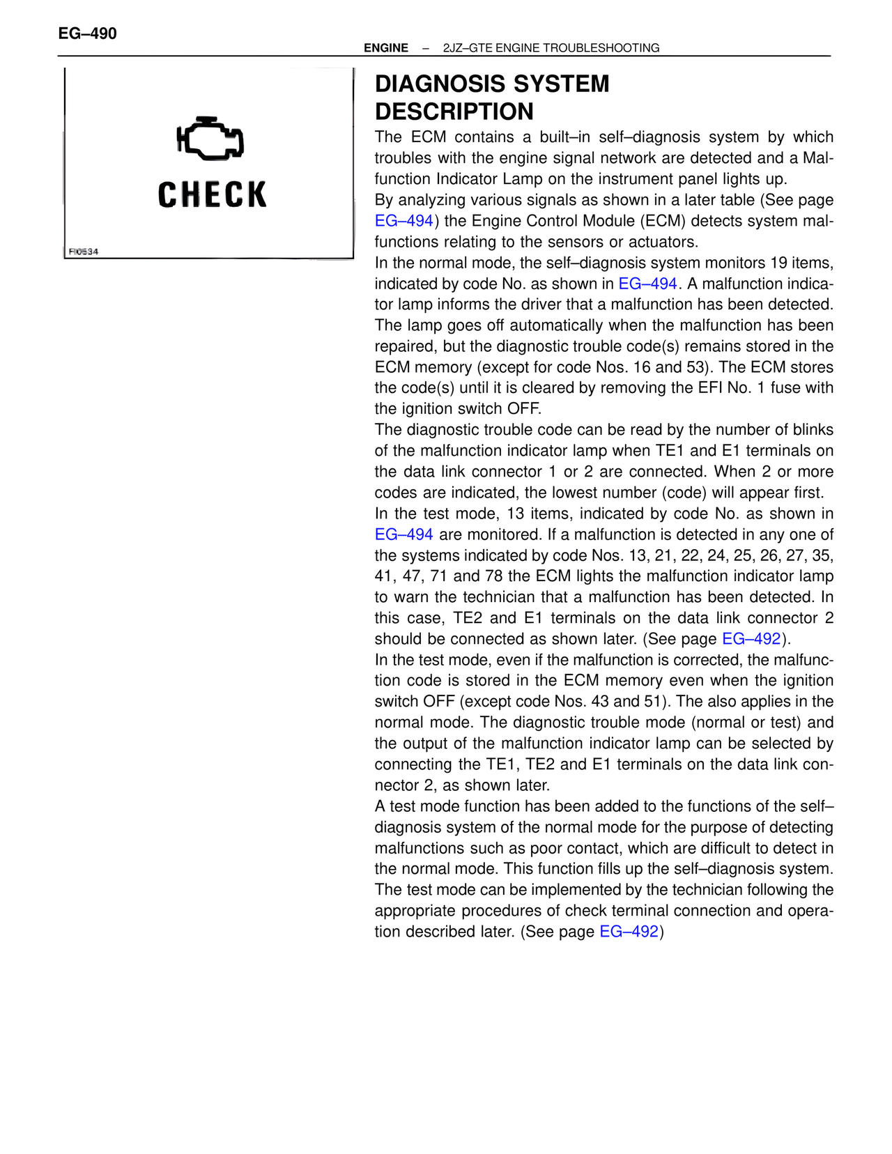 A test mode function has been added to the functions of the self–diagnosis system of the normal mode for the purpose of detecting malfunctions such as poor contact, which are difficult to detect in the normal mode. This function fills up the self–diagnosis system. The test mode can be implemented by the technician following the appropriate procedures of check terminal connection and operation described later. (See page EG–492)