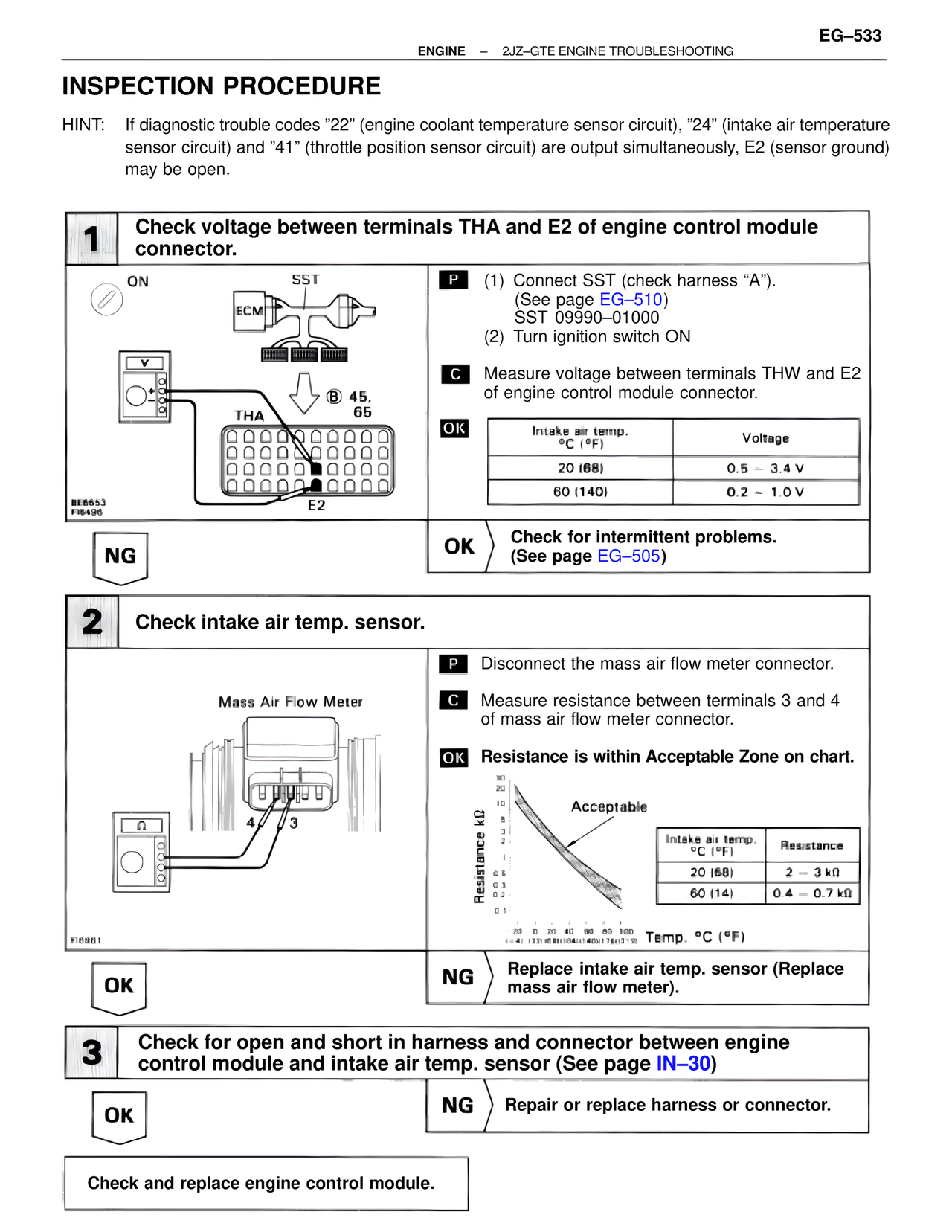 3 Check for open and short in harness and connector between engine control module and intake air temp. sensor (See page IN-30)