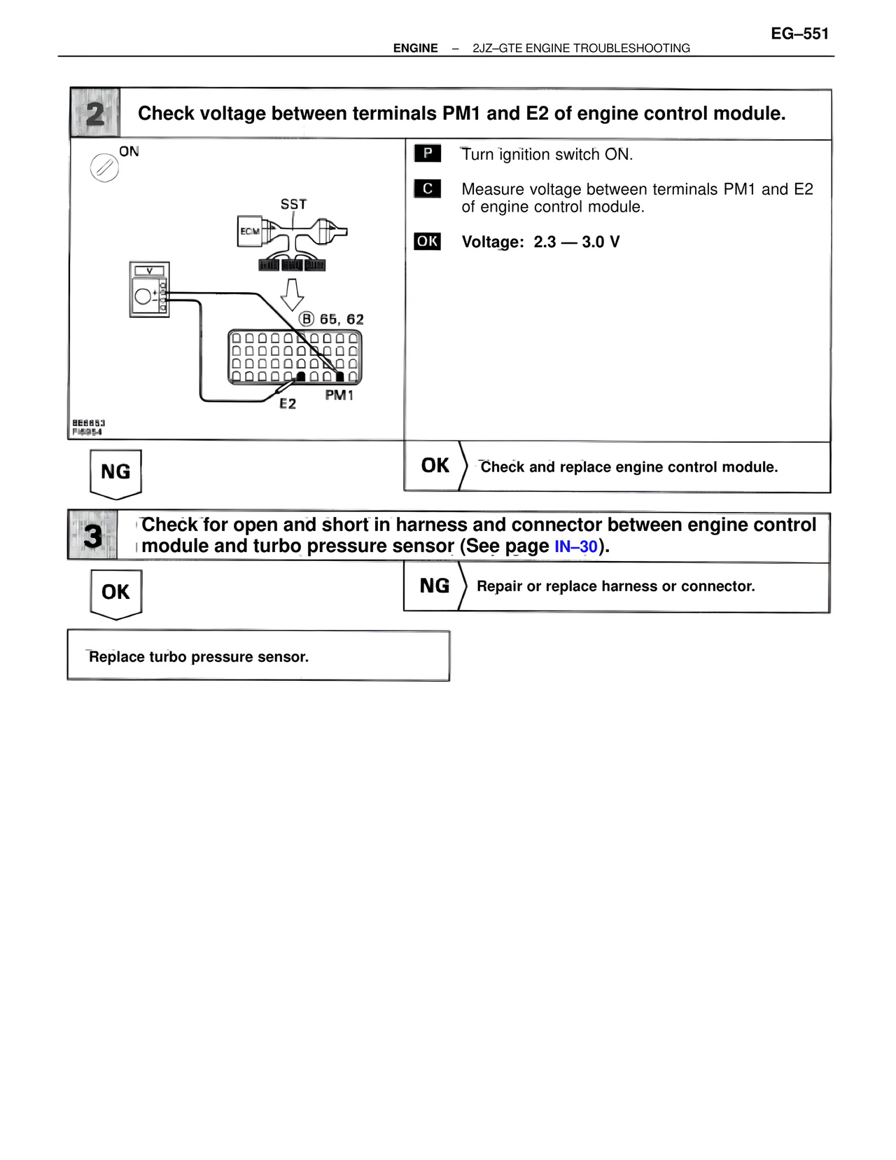 3 Check for open and short in harness and connector between engine control module and turbo pressure sensor (See page IN–30).