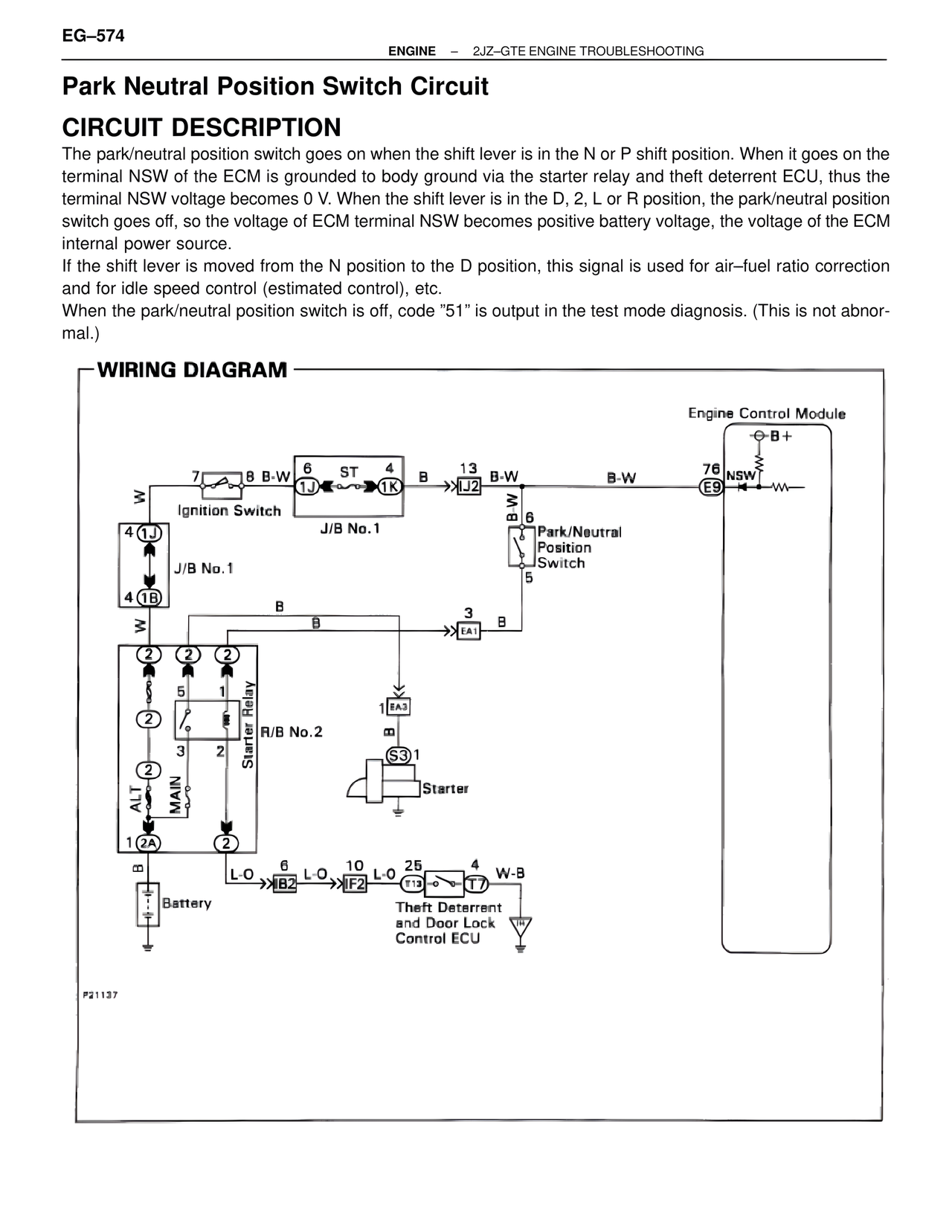 When the park/neutral position switch is off, code "51" is output in the test mode diagnosis. (This is not abnormal.)