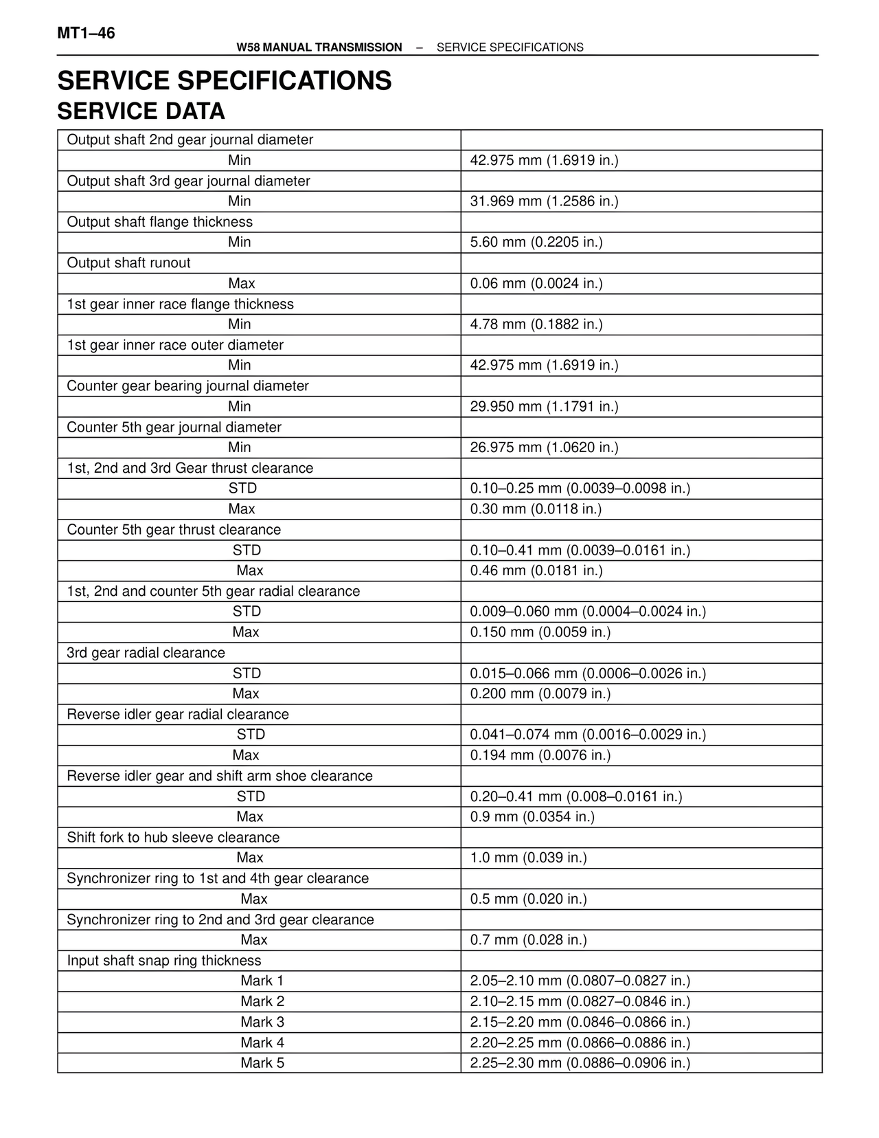 W58 MANUAL TRANSMISSION – SERVICE SPECIFICATIONS