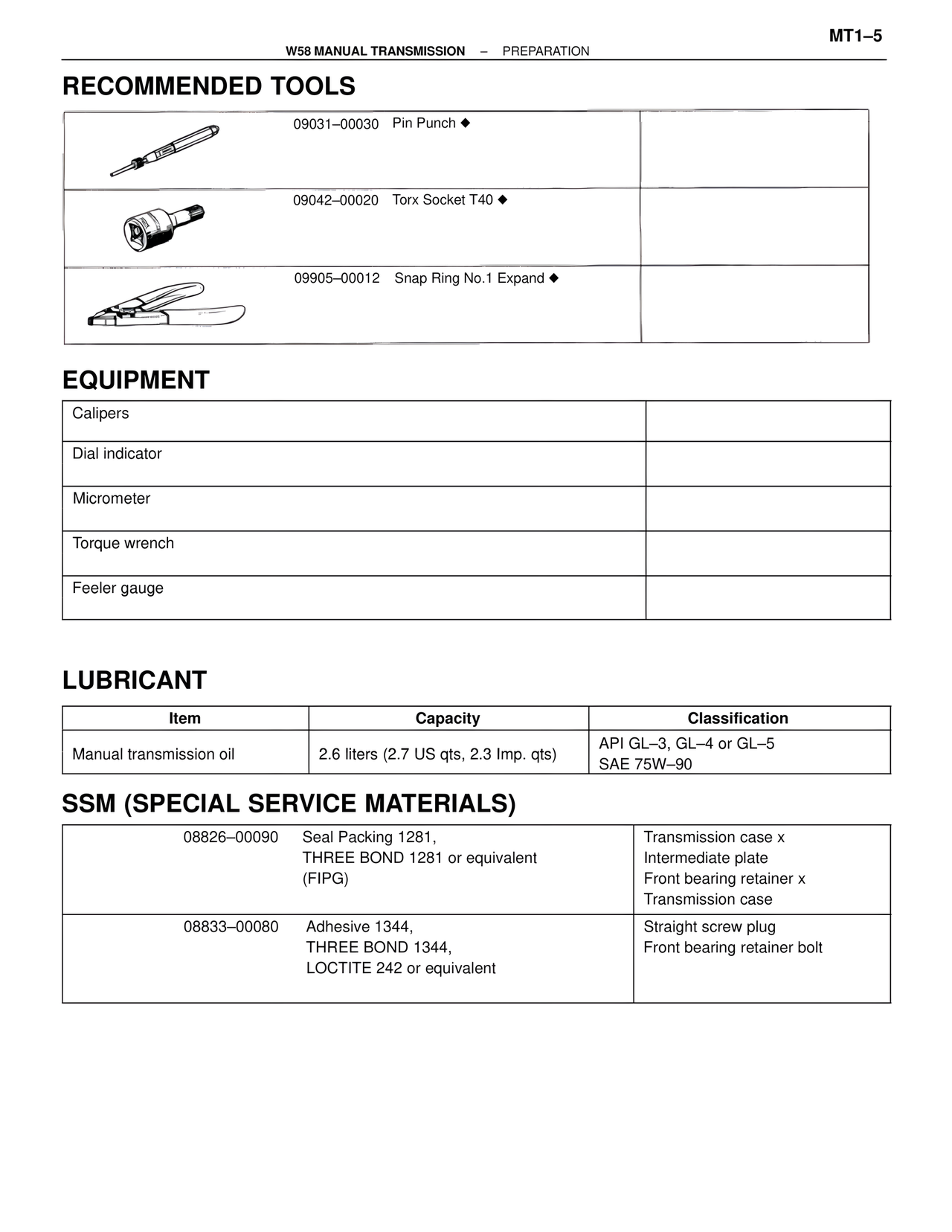 Manual transmission oil 2.6 liters (2.7 US qts, 2.3 Imp. qts) API GL–3, GL–4 or GL–5