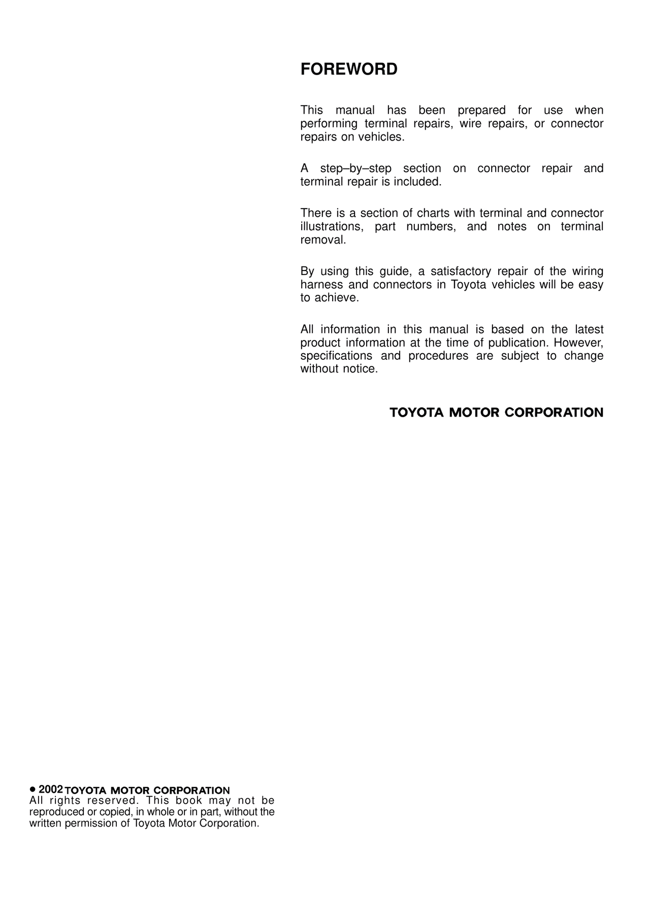 This manual has been prepared for use when performing terminal repairs, wire repairs, or connector repairs on vehicles.