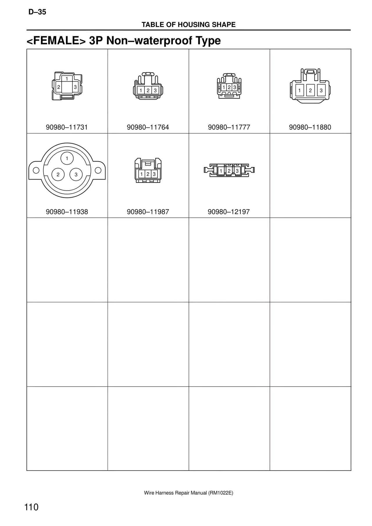 D–35 TABLE OF HOUSING SHAPE <FEMALE> 3P Non–waterproof Type 90980–11731 90980–11764 90980–11777 90980–11880 90980–11938 90980–11987 90980–12197 Wire Harness Repair Manual (RM1022E) 110