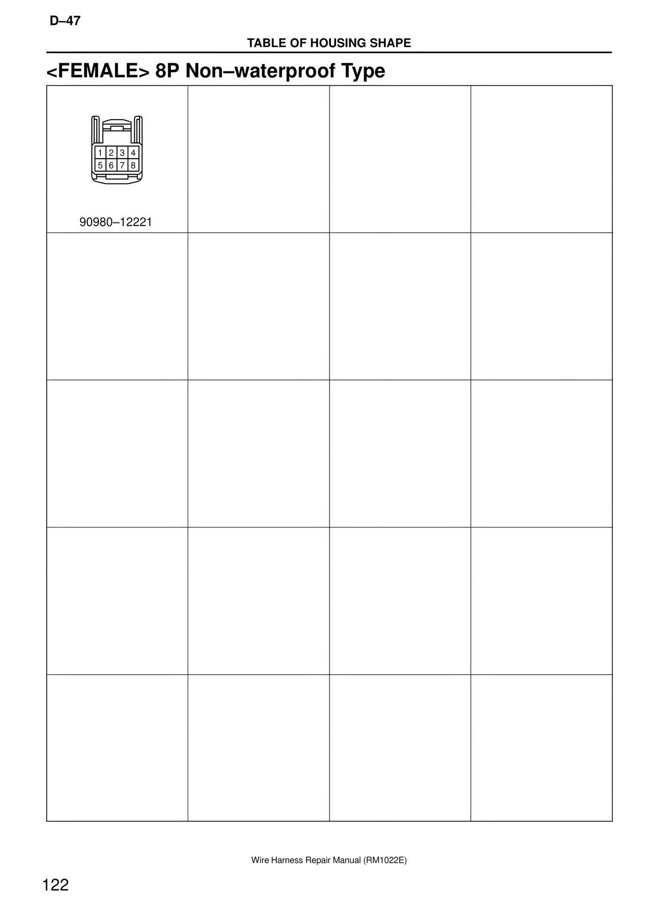 D–47 TABLE OF HOUSING SHAPE <FEMALE> 8P Non–waterproof Type 1 2 3 4 5 6 7 8 90980–12221 Wire Harness Repair Manual (RM1022E) 122