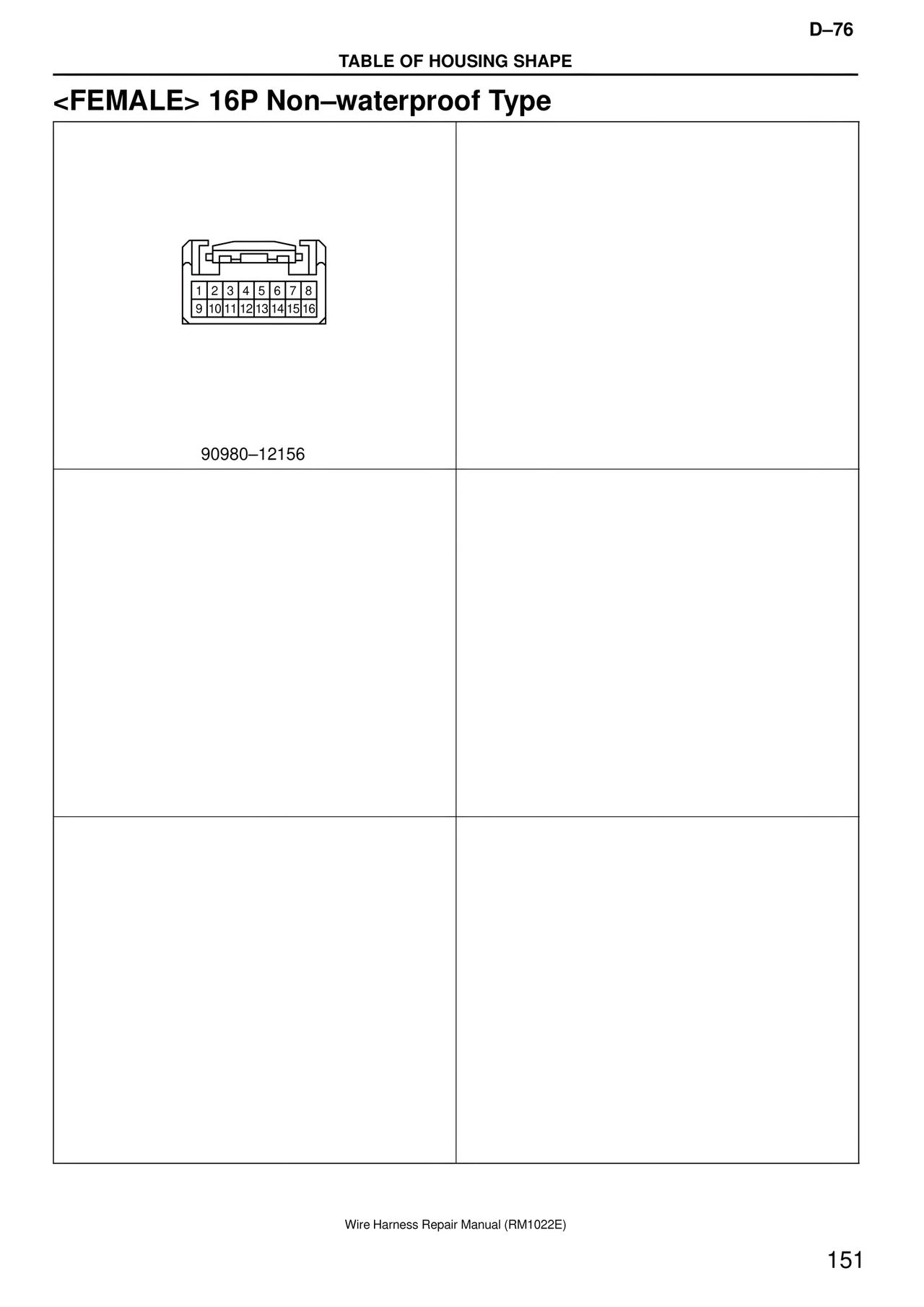 D–76 TABLE OF HOUSING SHAPE <FEMALE> 16P Non–waterproof Type 1 2 3 4 5 6 7 8 9 10 11 12 13 14 15 16 90980–12156 Wire Harness Repair Manual (RM1022E) 151