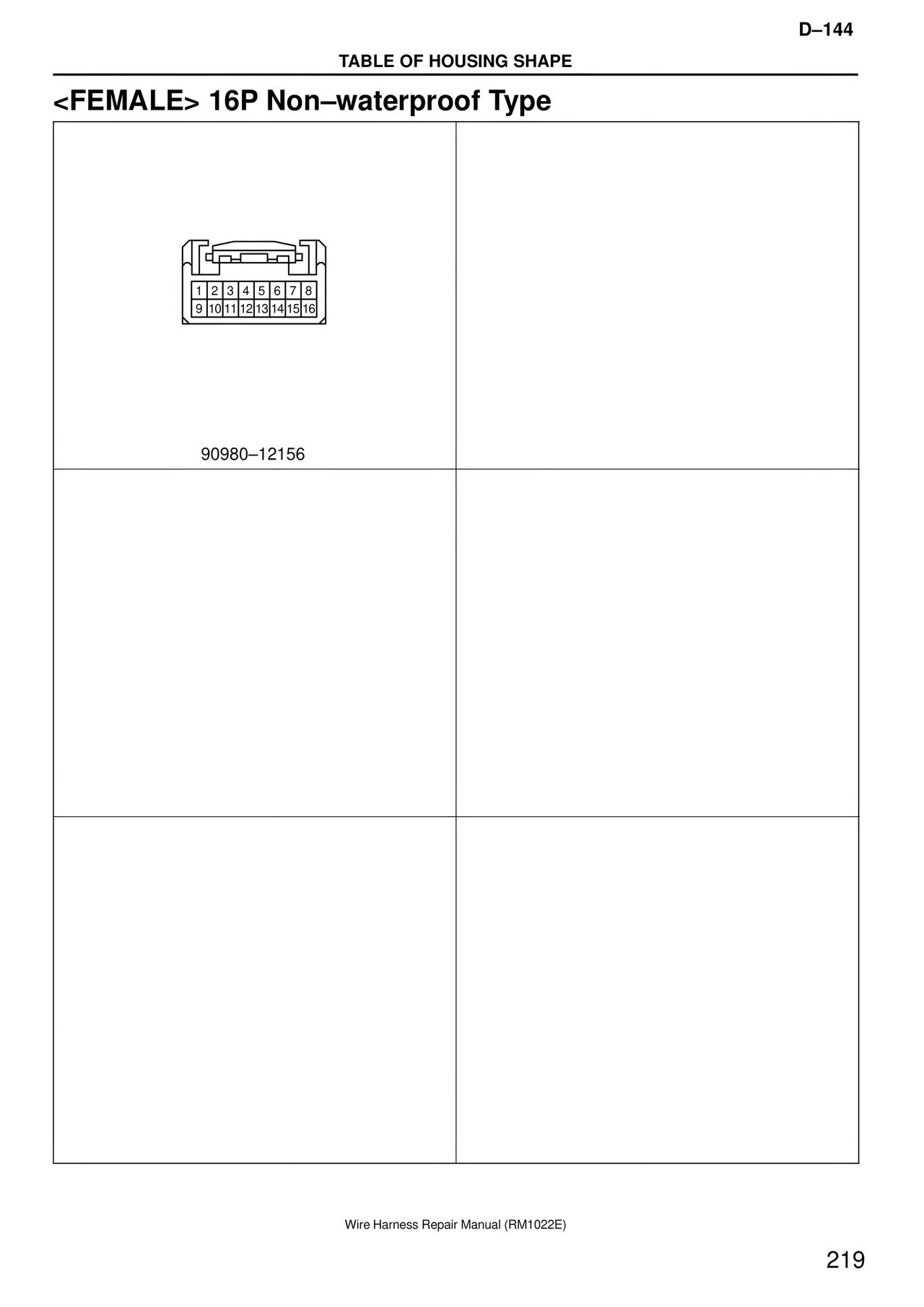 D–144 TABLE OF HOUSING SHAPE <FEMALE> 16P Non–waterproof Type 1 2 3 4 5 6 7 8 9 10 11 12 13 14 15 16 90980–12156 Wire Harness Repair Manual (RM1022E) 219