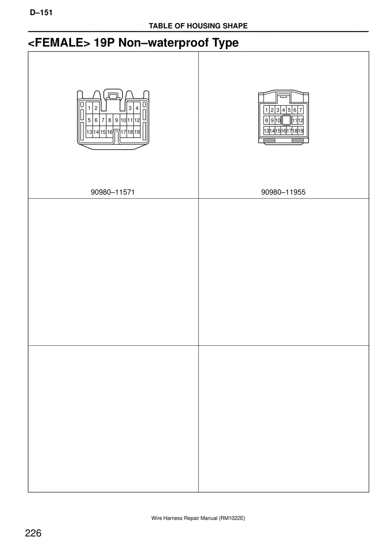 D–151 TABLE OF HOUSING SHAPE <FEMALE> 19P Non–waterproof Type 1 2 3 4 5 6 7 8 9 10 11 12 13 14 15 16 17 18 19 90980–11571 1 2 3 4 5 6 7 8 9 10 11 12 13 14 15 16 17 18 19 90980–11955 Wire Harness Repair Manual (RM1022E) 226