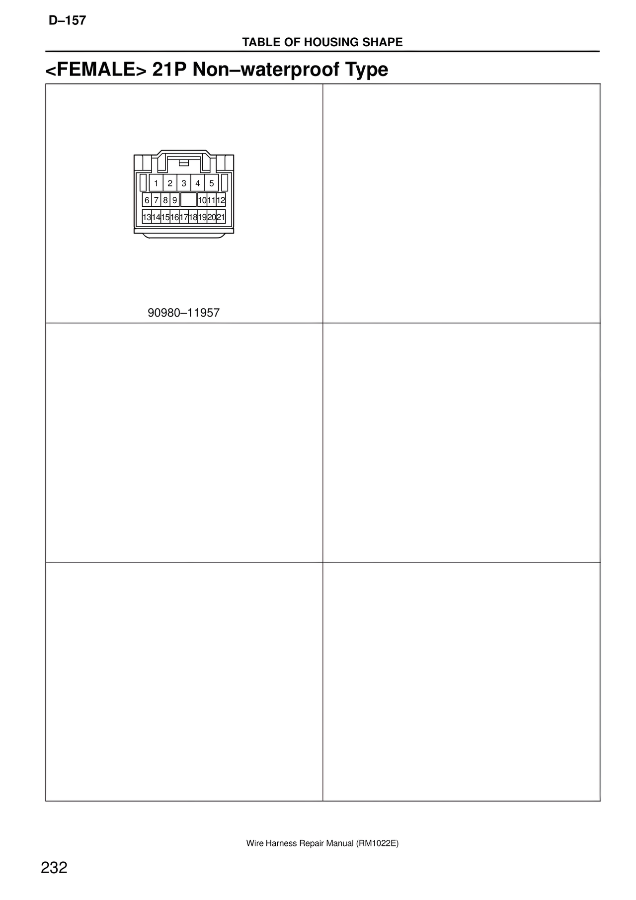 D–157 TABLE OF HOUSING SHAPE <FEMALE> 21P Non–waterproof Type 1 2 3 4 5 6 7 8 9 10 11 12 13 14 15 16 17 18 19 20 21 90980–11957 Wire Harness Repair Manual (RM1022E) 232